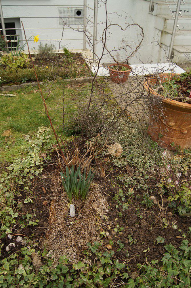 Zwei meiner schönsten Container habe ich in die Gärten ausgesiedelt. Auf dem Foto rechts ist noch die rechteckige Form an den vertrockneten Waldmeisterblättern zu erkennen. Mit im Rollcontainer waren: Eine kleine Hortensie, eine wundervoll duftende Rosenmelisse und ein Zickzackstrauch. Macht sich wirklich gut hier, entfaltet seine Schönheit aber natürlich erst im Sommer. Dafür ist jetzt Platz für neue Minilandschaften. Wie das neue Pflanzenstilleben mit Froschkönig oben. Extra für meine Tochter angepflanzt. Sie findet es super.