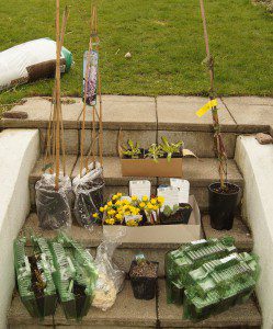 Zurück zum Thema: Es stehen etliche Stauden bereit zum einpflanzen. Auf der Treppe warten nun: Jeweils 3 Sterndolden „Alba“ und „Moulin Rouge“, zwei Blauregen (links), eine purpurfarbene Clematis (rechts). In den Beuteln auf der unteren Stufe sind Tobinamburwurzeln und noch 3 blaue Edeldisteln „Blue Hobbit“, sowie eine Stendelwurz-Orchidee „Sabine“ (Epipactis-Hypride), 3 Fetthennen in kaminrot und noch 2 Meerlavendel. Tobinambur und Meerlavendel kommen allerdings in den Kleingarten. Ich plane die linke Gartenseite eher in Rot zu halten und die rechte in Blau. Natürlich mit kleinen farbigen Brüchen in Gelb und Rosa.