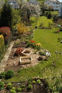 Dann bleiben aber immer noch viele Gemüsesorten übrig, die in den Hausgarten müssen. Also werden die Gemüse Anbauflächen im Hausgarten ausgebaut. Platz ist ja genügend da. Ganz viel freie Fläche – auch wenn „Mann“ mir verboten hat, die Rasenfläche zu sehr zu verkleinern. Auf der linken Gartenseite im unteren Teil gibt es eine größere Fläche, die verwildert ist. Hier standen vorher etliche Rhododendren, welche der Vorbesitzer alle mitgenommen hat. In der Erde sind noch viele Blumenzwiebeln, doch die stören mich nicht. Mit Reststücken der Beetumrandungen aus dem Kleingarten baue ich vier kleine Gemüsebeete auf in Form eines Mini-Bauerngartens.