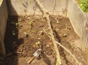 Zuerst habe ich die Erbsen eingepflanzt. Die stehen schon seit fast vier Wochen parat und warten auf den Umzug. Die Wurzeln haben sich schon ineinander verhakt. Zur Stütze habe ich vier bzw. 3 Apfelbaumäste in den Boden gesteckt, welche ich später noch mit einem Seil als zusätzliche Rankhilfe versehen werde. Davor sechs rote Beete. Dann waren die 6 Maispflänzchen dran. Denen habe ich neben einem Extra Wasser auch eine Extra Portion organischen Dünger mitgegeben. Zusätzlich habe ich den Boden rund um die Maispflänzchen mit Stroh bedeckt, damit die Wurzeln nicht austrocknen. Die nächste Einpflanzrunde ging dann an die verschiedenen Kohlarten. Vor rund 6 Wochen habe ich neben den Grünkohlarten auch roten und grünen Spitzkohl ausgesät. Die Setzlinge haben sich sehr gut entwickelt und ich möchte unbedingt die Köpfe durchbringen. Deshalb sind die Pflänzchen auch nicht in den üblichen Gemüsebeeten eingezogen, sondern in den präparierten Beeten vorne. Ich habe die Hoffnung, dass die dicke Unkrautfolie auch ein wenig die Mäuse zurück halten wird. Nun sollen zwischen einem Meer aus Blumen und Töpfen die verschiedenste Kohlarten auch zur Zierde dienen. Wirsing, Spitzkohl Kalidos und Winningstadt, Palmkohlt, roter und grüner Grünkohl und Wirsing tummeln sich zwischen schwarzen Mohn, Gladiolen, Kornblume und Co.