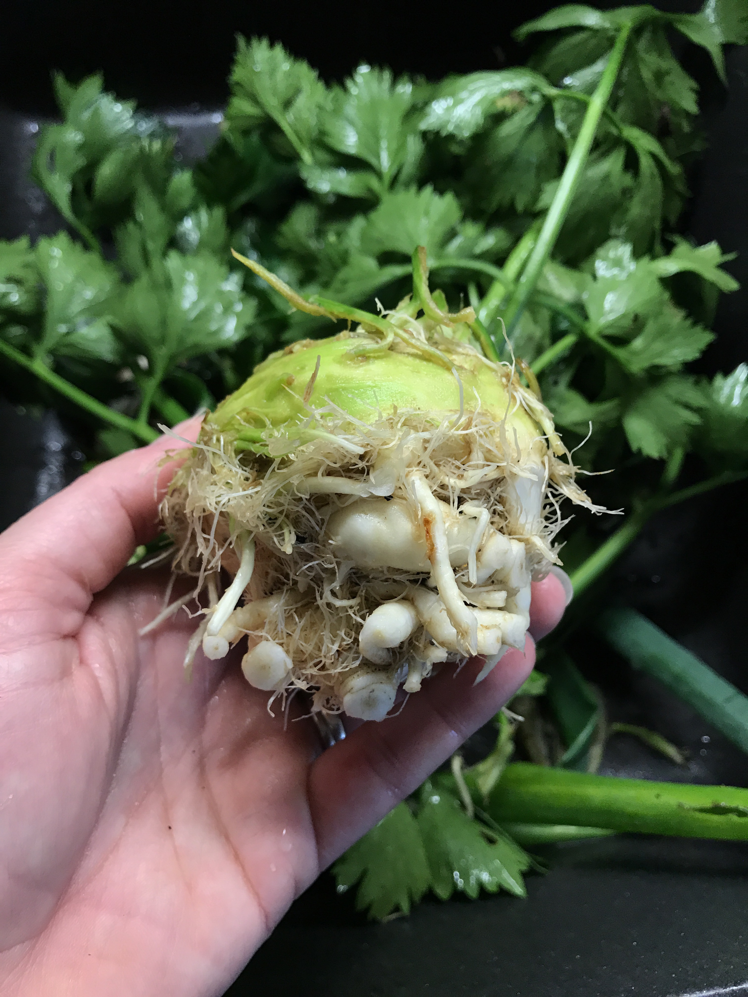 Heute ernte ich einfach mal einer meiner kleinen Knollen für eine leckere Suppe. Eigentlich gar nicht schlecht, wenn sie so klein sind. Dann gibt es wenigstens keine Reststücke. Das Grün, welches jetzt schön und saftig dasteht, wird natürlich nicht weggeschmissen. Ich trockne es immer und reibe es klein in ein Glas. Dann habe ich es immer schnell zur Hand zum würzen von Soßen und Suppen. Die getrockneten Flocken halten sich locker ein Jahr. Zumindest theoretisch, denn meist habe ich die Blätter schon aufgebraucht, bevor es neues Grün gibt.