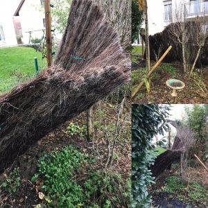 Heute nun, bei der Reparatur des Heidekrautwurzel Zaunes – der letzte Sturm war einer zuviel für die Halterung -, habe ich endlich einmal die Ableger des Perückenstrauches kontrolliert. Und tatsächlich haben zwei der Zweige Wurzeln gebildet. Allerdings noch nicht ausreichend, die Wurzeln müssen noch stärker werden, bevor die neuen Perückensträucher auch wirklich überlebensfähig sind. So lange dürfen sie am Mutterbaum weiter wachsen. Immerhin gibt es zwei potentielle Nachfolger meines geliebten Strauches.