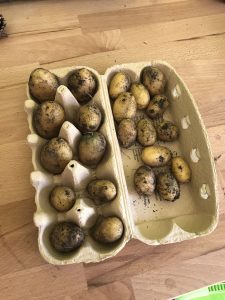 Um die Ernte der Kartoffeln vorzuziehen, wird die Kartoffel „angetrieben“. Jeder kennt ja Kartoffeln, die nach einigen Wochen Lagerung im Kartoffeleimer auf einmal starke Triebe zeigen. Diese Kartoffeln bilden im Beet schneller Knollen, da das Wachstum vorgezogen ist. Deshalb schieben jetzt bei rund 15° C die Kartoffel fleißig Triebe in Eierkartons am Fenster. Eierkartons haben sich als sehr praktisch erwiesen, da die Kartoffeln darin aufrecht stehen und die Triebe nicht aus Versehen abgebrochen werden können.