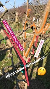 Noch ein Wort zum Quirrlholz: Das sind kleine Verästelungen direkt an den Leitästen mit einem geringen Längenwachstum. diese werden auch Regelmäßig rausgeschnitten bzw. rausgebrochen. Die Wasserschoße hingegen können vereinzelt richtig gezogen ein Ersatz werden für einen Leitast werden. Aber hier geht es schon in die Hohe Kunst des Obstbaum Schnittes. Dafür ist dann noch ein weitere Kurs nötig.