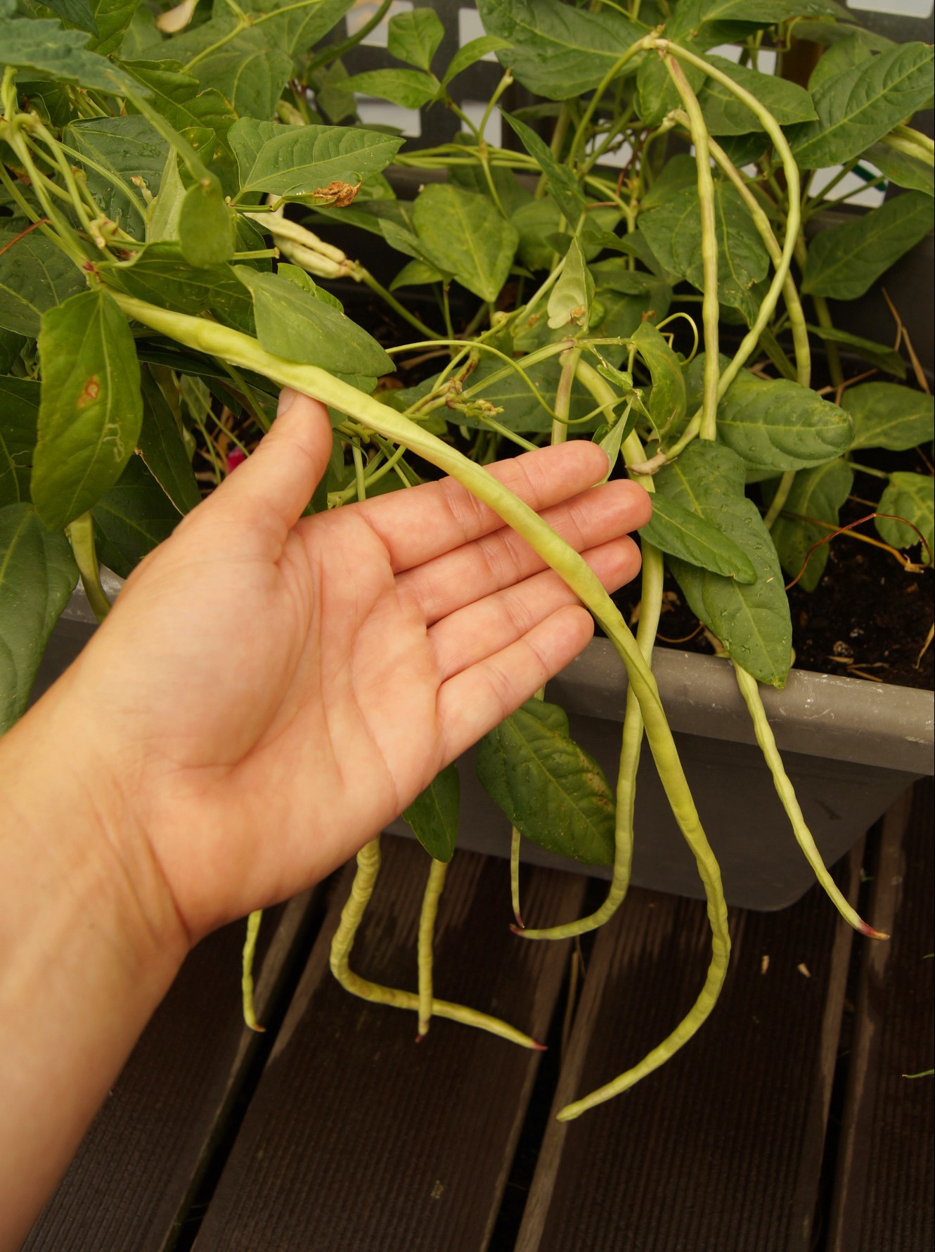 Was hingegen nicht funktioniert ist der Anbau der Schlangenbohnen auf einer heißen Südterrasse. Sie mögen es zwar warm, aber trockene Hitze lässt sie verkümmern. Die sehr heißen Sommermonate der letzten Jahre hat auch bei der Schlangenbohne den Ertrag einbrechen lassen.
