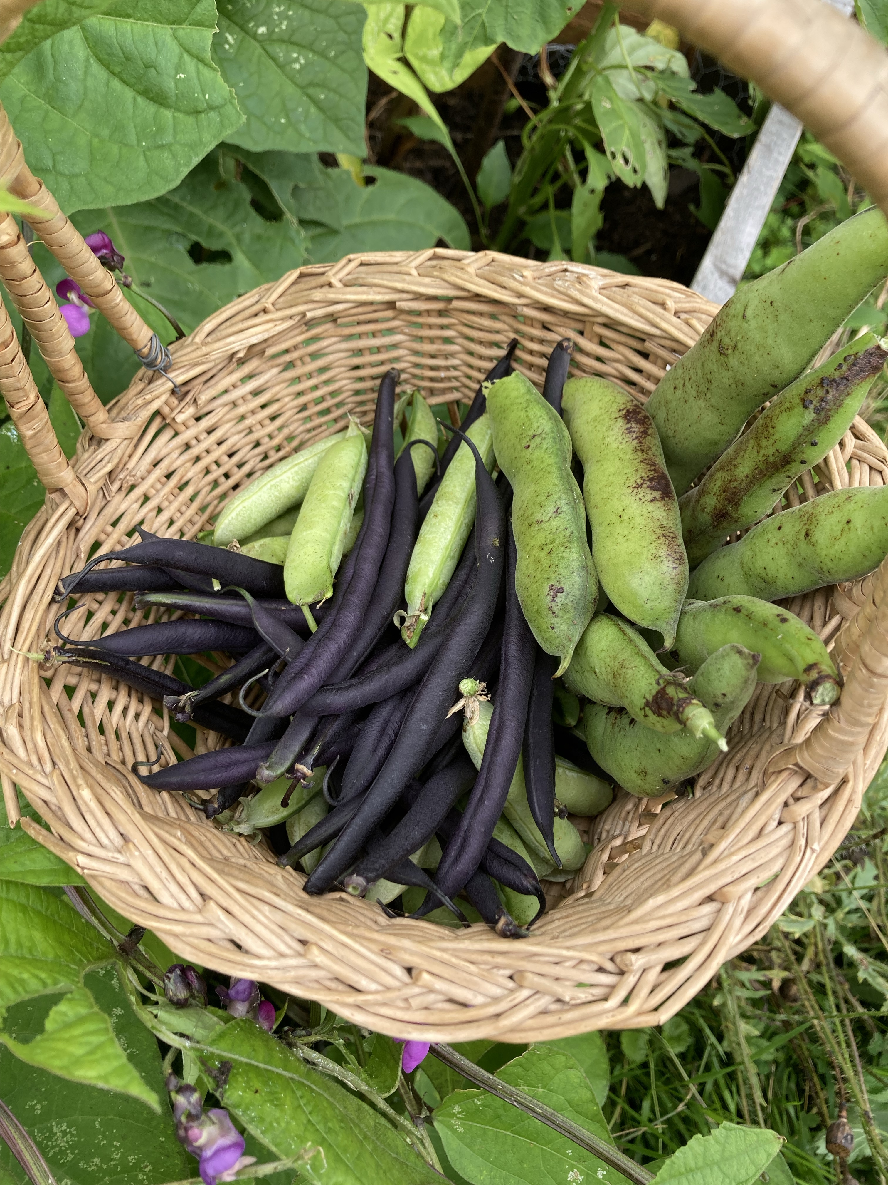 Schon das Ernten des Gemüses macht richtig Laune. Heute ziehe ich drei Karotten und eine Pastinake aus dem Boden. Weiter geht es mit den verschiedensten Bohnen, eine Zucchini, Sellerie Stängel, Tomaten, eine Zwiebel. Abgeschmeckt wird mit frischem Oregano und Thymian. Da der Weißkohl dieses Jahr nichts geworden ist, kommen klein geschnittener Palmkohl und Grünkohlblätter mit in die Minestrone. Die Puffbohnen und Erbsen sind aus dem Tiefkühlschrank. All das was ich heute frisch geerntet habe, sieht man auf dem Teller. Ist das nicht ein wundervoller Anblick?