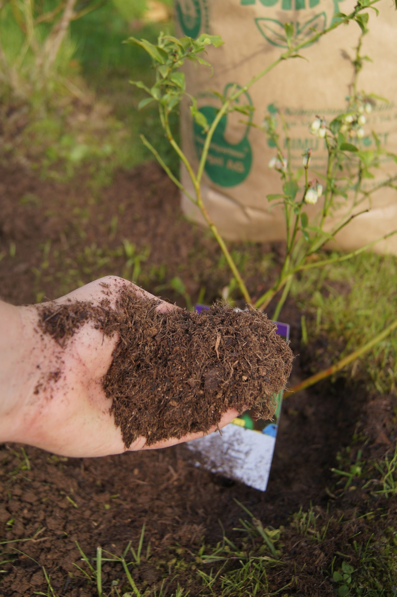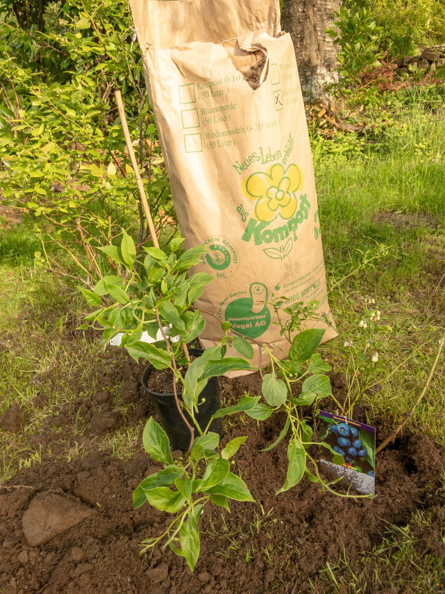 Gut, dass ich noch Erde von der Pflanzung meiner neuen Heidelbeere übrig habe. Gedüngt wird mit Kompost und einer ordentlichen Gabe an Hornspäne. Doch diese Düngergabe nur bei der Auspflanzung beimengen. Später sollten Kiwibeeren auf Magerkost gesetzt werden, also zurükhaltend sein bei der Düngung. Bei zuviel Nährstoffe bilden Kiwibeeren (und Kiwi) nur Blattmasse, aber keine Blüten und Früchte.