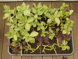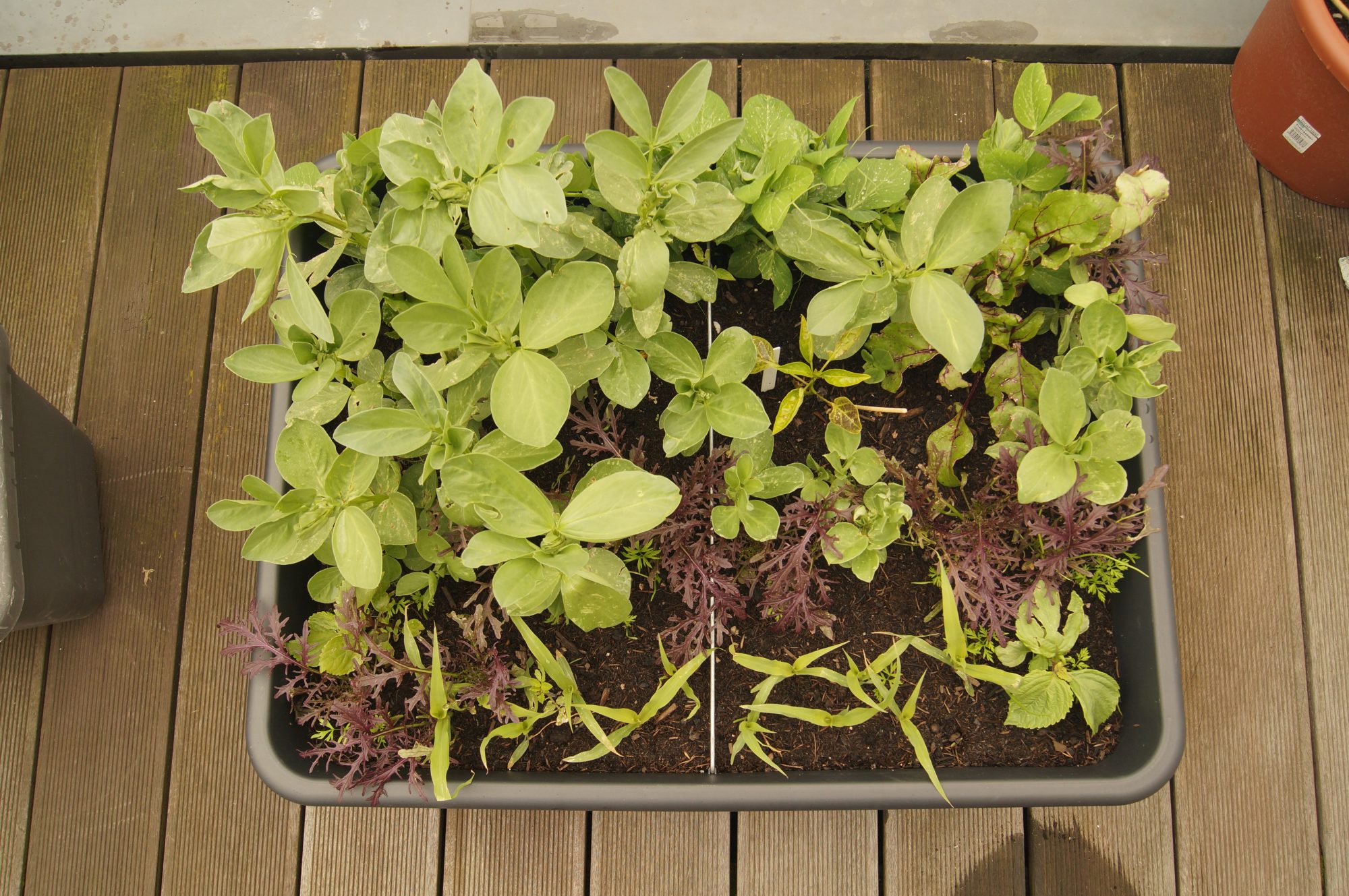 Heute nun der Start für die wärmebedürftigen Pflanzen. Der Pflanztisch wird von mir zur Hälfte mit Erde befüllt. So sind die Setzlinge Anfangs noch etwas windgeschützt. Die Pflanztiefe ist dank der Höhe der Wanne trotzdem ausreichend. Auf die Pflanzerde kommt Kompost und ein spezieller Dünger für Hochbeete mit Schafswolle als Stickstofflieferant. So, zwischen den „PapChiAu“ finden auch noch 3 rosa Stangensellerie, Salat und Petersiliensetzlinge platz. Klar, hier sitzt alles viel enger als im im Gemüsebeet. Aber solange alle Pflanzen ausreichend Licht und Nährstoffe erhalten, wird für mich das Ergebnis super sein. Es ist bewundernswert, wie viel die Pflanzen trotzdem wachsen lassen. Und ist der schnell wachsende Salat abgeerntet, können sich die anderen Pflanzen ausbreiten. Das sieht man beim kleinen Pflanztisch. Hier habe ich schon 2 der 6 Salate geerntet. Dort wo Platz ist, ziehen Paprikapflänzchen ein.