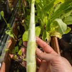 Es geht hier nicht um einen Salat aus weißem oder grünem Spargel. Es geht um eine besondere Salatpflanze, welche in der Form eines Stangespargels daher kommt, wenn er entblättert worden ist. Gegessen wird vom „Chinesischem Salat“ (Lactuca sativa var. angustana) – wie er auch genannt wird – vorwiegend der Stängel bzw. Stamm. Der kann bei großen Exemplaren 3-4 cm dick werden kann. In den Pflanzkübeln des Balkongartens werden sie nicht ganz so groß und dick.