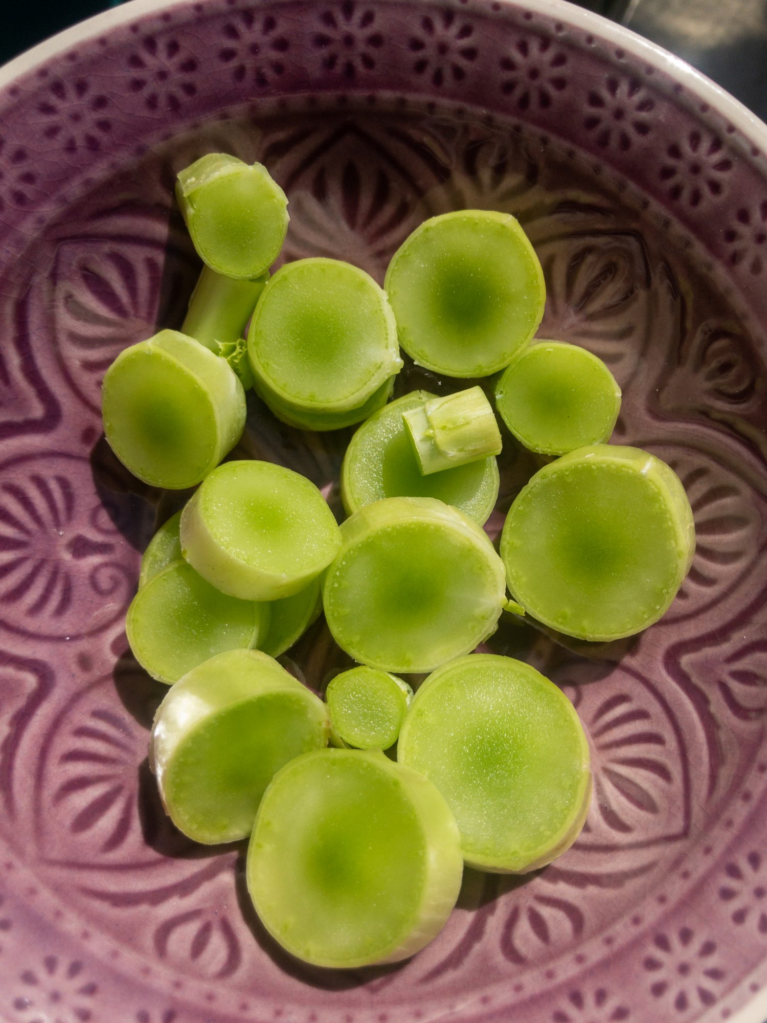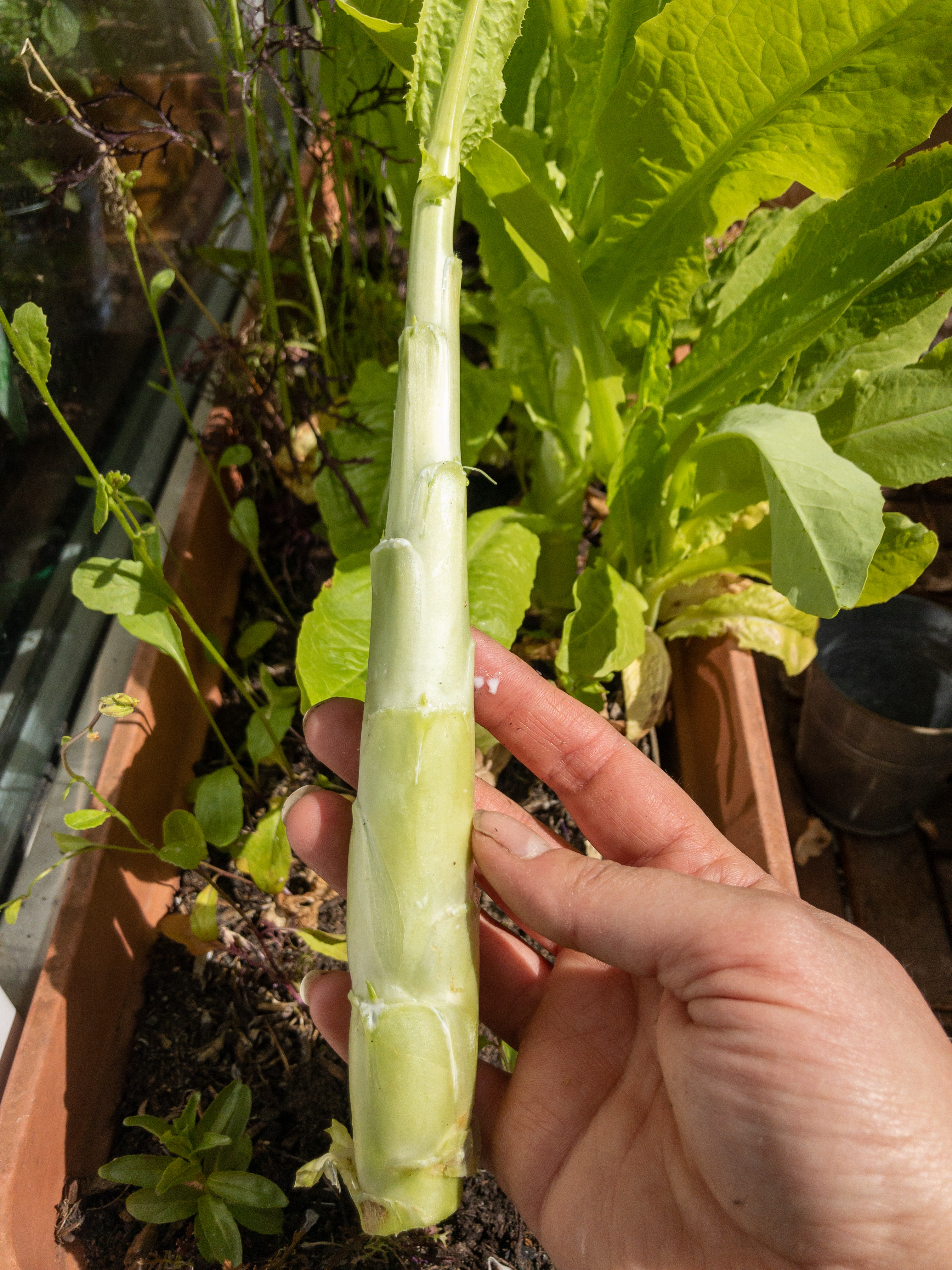 Die Salatstangen sind wirklich lecker und ich esse sie sehr gerne. Ungefähr Daumendick schmecken sie am Besten. Dann haben sie einen leicht nussigen, intensiven Salatgeschmack mit einem dezent bitteren Unterton. In Scheiben geschnitten esse ich ihn am liebsten in einem frischen, gemischten Salat. Die Stangen breche ich ab und schneide sie in Scheiben. Sind die Blätter noch nicht bitter, werden sie abgezupft und kommen auch in den Salat. Der Spargelsalat kann auch ganz kurz in etwas Öl angebraten werden. Soooo lecker.