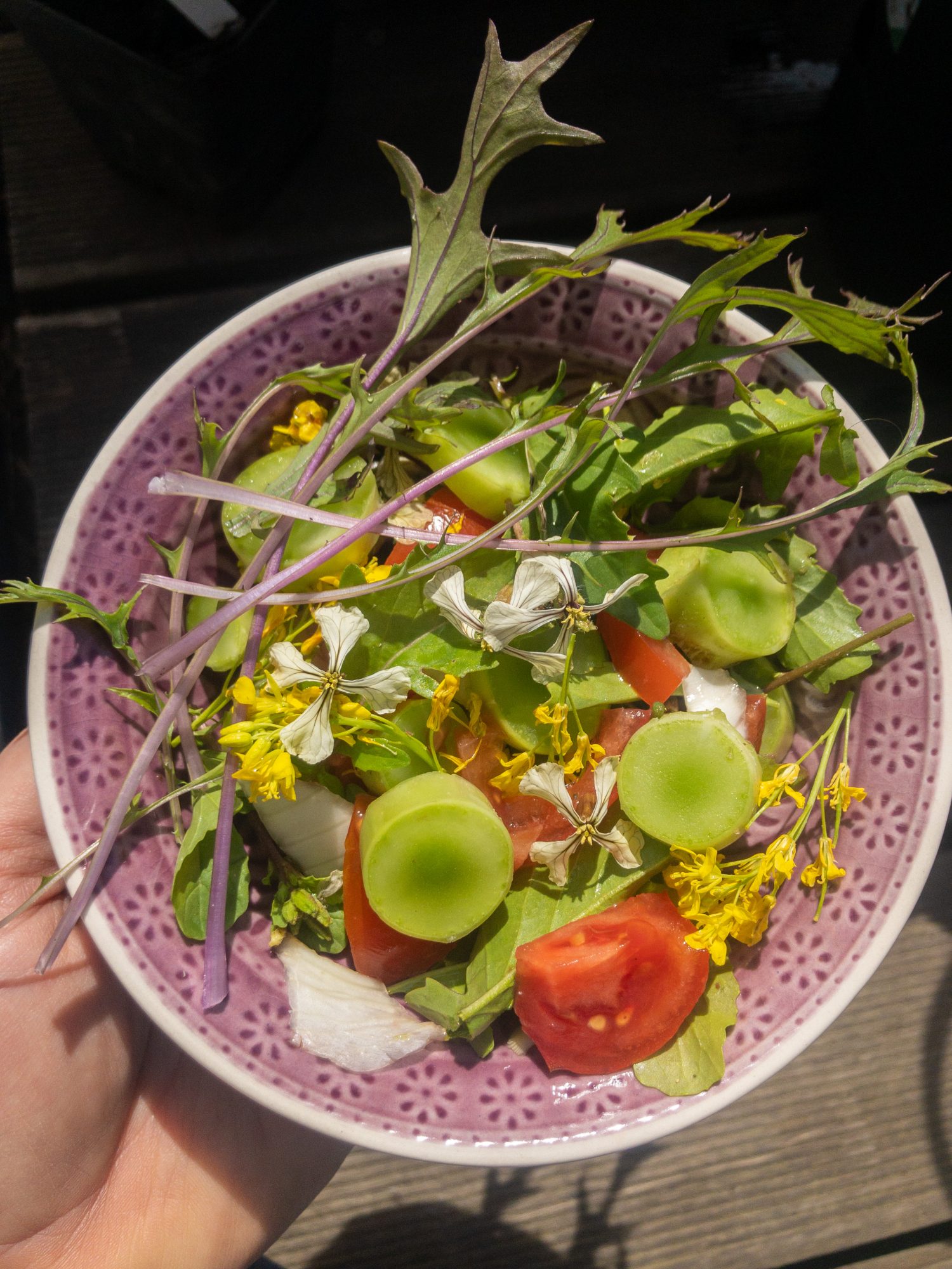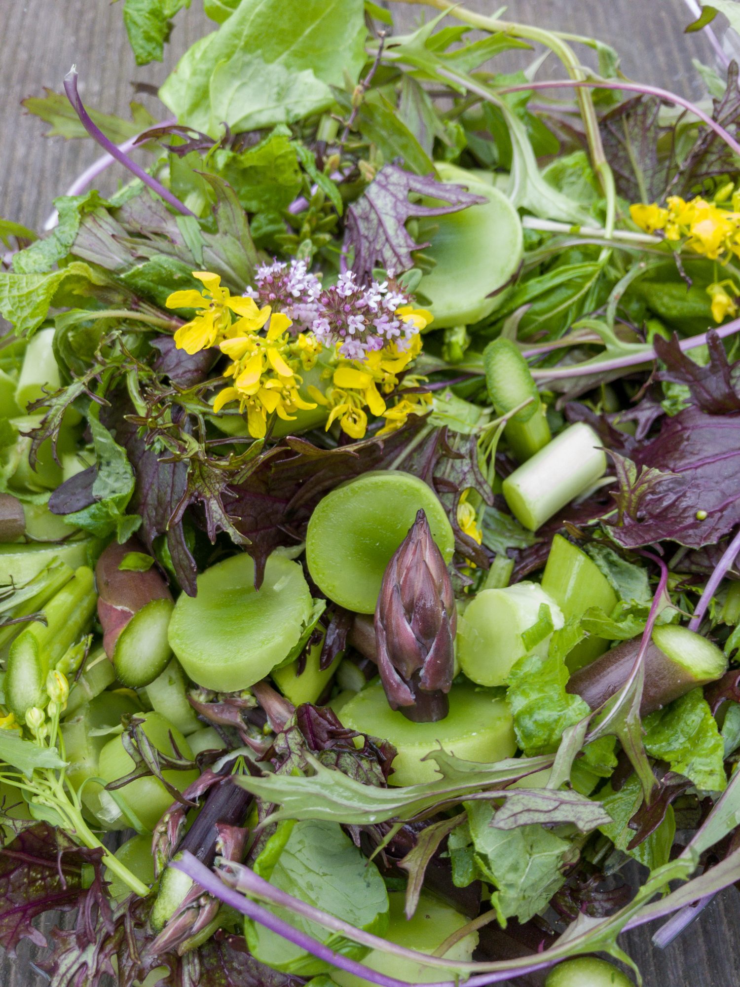 - Alles in eine Salatschüssel geben. Die kleinen Samenstände der Zwiebelblüte in den Salat schneiden. Salzen, dann Essig untermengen und zum Schluss Öl. Der letzte Kick kommt durch ein paar fein geschnittene Blätter der Zitronenmelisse.
