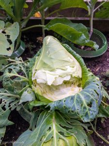Anfang der Woche habe ich im Garten den ersten Spitzkohl aus dem GartenGarten geholt. Nicht weil er schon groß genug war, sondern weil irgendein Tier ein ordentliches Stück heraus genagt hatte. Die erste Attacke durch die Raupen des Kohlweißling hatte ich ja erfolgreich mit „Xentari“ abgewehrt. Diesmal sieht es aber so aus, als ob sich eine Ratte über den Kopf hergemacht hat. Damit der Rest nicht vergammelt, habe ich den Spitzkohl mit nach Hause genommen.