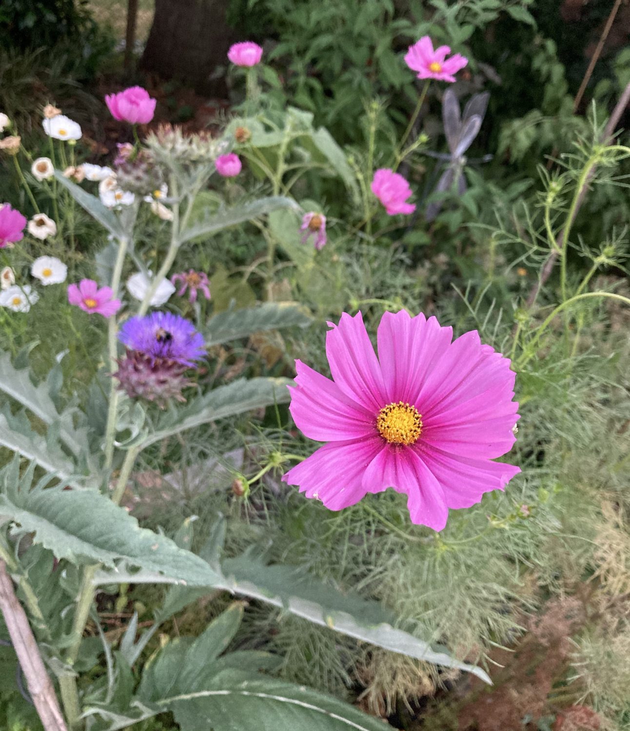 In den Blumenbeeten, welche ich im Frühjahr neu angelegt habe, ist jetzt der Blühhöhepunkt erreicht. („Blumenbeet im Rasen“) Endlich zeigen sich auch die Schmuckkörbchen / Cosmea. Diese grazilen Schönheiten haben mich schon lange in den Bann gezogen.