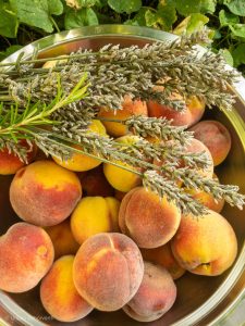1 Flasche Weiswein, 1 Handvoll Lavendelblüten, 3 El Zucker, 1 Zweig Rosmarin, 2 kg Pfirsich