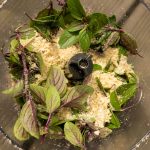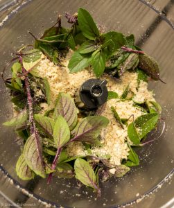 - Die Basilikumblätter abzupfen und mit den Haselnusskernen zermahlen.