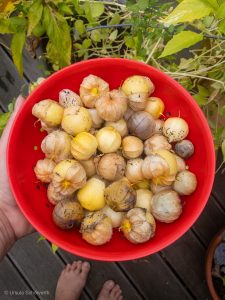 Die gelben Tomatilla haben sich als erstaunlich produktiv heraus gestellt. Ich kann jetzt gegen Ende der Tomatillo Saison die Frücht schüsselweise heraus ernten. Ein fulminantes Finale, welches ich nun richtig feiern will. Diesmal ein ganz anderes, aber mindestens genauso leckeres Rezept: Tomatillo Gemüse mit Garnelen und Feta. Exotische Beilage zu einem Mexikanischem Essen. Oder als Hauptgang. Dann würde ich Salzkartoffeln dazu reichen.Diesmal ein ganz anderes, aber mindestens genauso leckeres Rezept: