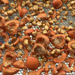 Die Kerne haben für rund 6 Stunden bei 40 °C im Dörrautomat getrocknet. Das Fruchtflleisch der Hagebutten braucht deutlich länger. Damit der Tee noch fruchtiger wird, mache ich eine Mischung mit gedörrten Apfelstücken. Ich überlege, ob ich auch noch etwas Pfefferminze hinzu gebe? Lieber nicht, dann würde der feine Geschmack der Hagebutte hinter dem intensiven Geschmack der Pfefferminze verschwinden.