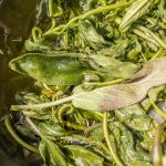 Also her mit den Salbei Blättern. Wir brauchen einen Hustensaft für unseren Jüngsten. Zusammen schneiden wir die Zweige und zupfen sie sauber ab. Zuerst löse ich den Zucker im Wasser auf und lasse die Flüssigkeit köchelnd reduzieren. Erst wenn die gewünschte Konsistenz erreicht ist, gebe ich die Blätter hinzu. So entweichen nicht so viele der Ätherischen Öle, welche den Hustensaft so gesund machen.