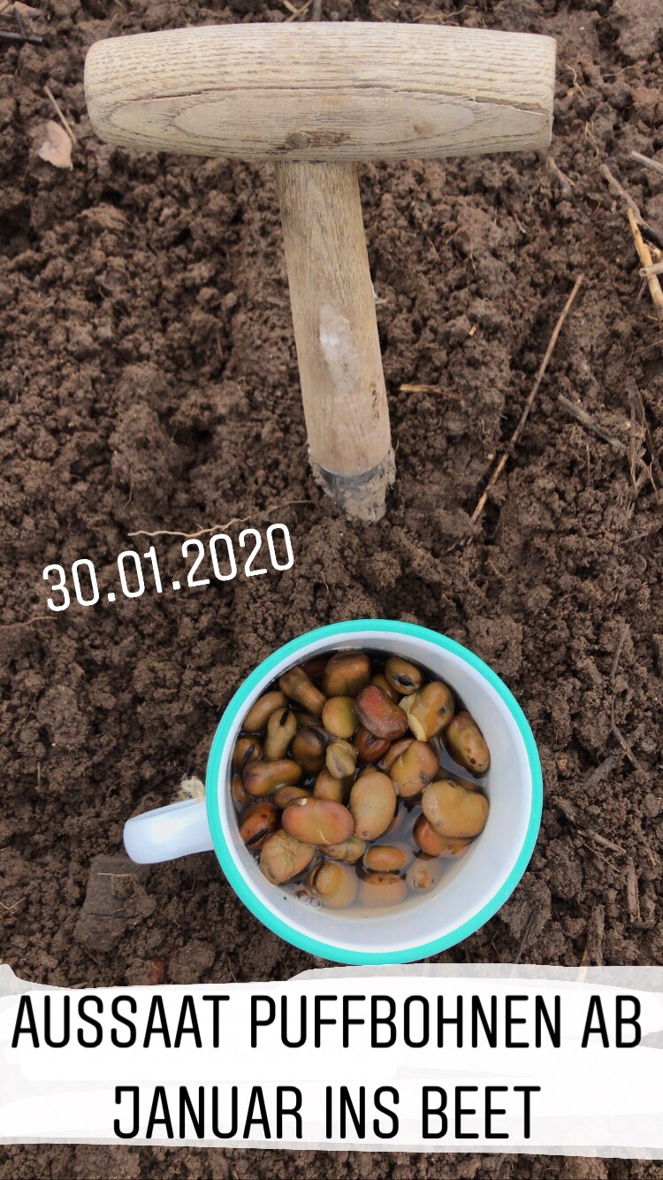 Bereits am 30. Januar habe ich die ersten 50 Kerne der Sorte „Emperial Green Longpod“ jeweils 4 cm tief in den Boden gesteckt. Sie sind die Vorfrucht für den Rosenkohl und Grünkohl. Ebenso wie Erbsen, reichern auch die Puffbohnen mittels Knöllchenbakterien an den Wurzeln, Stickstoff im Boden an. Der kommt dann später den Starkzehrern zugute. Die Aussaat so früh im Jahr scheint verfrüht zu sein. Doch abgesehen davon, dass es bei uns in Baden im Schnitt wärmer ist: Puffbohnen vertragen das. Der Vorsprung ist auch nötig, da ab Mai die schwarze Blattlaus immer die Puffbohnen flutet. Wenn die Blüte der Puffbohne da schon durch ist, ist der Ertrag höher.