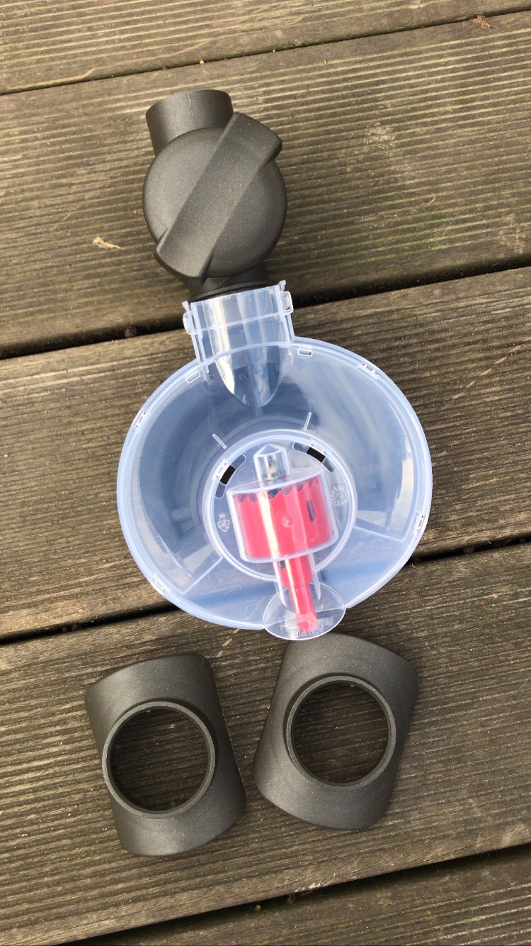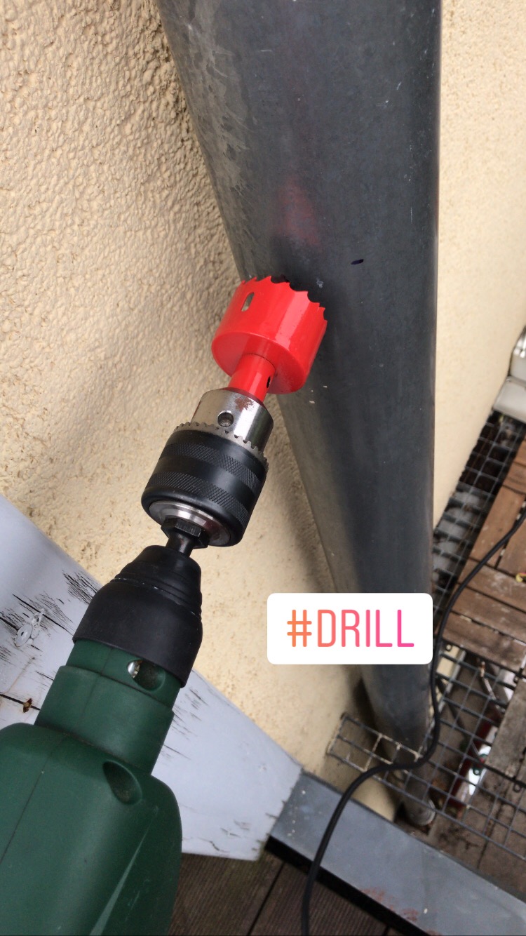 … dann beginnt die eigentliche Herausforderung. Die Verbindung zum Regenfallrohr muss extra erworben werden. Die „Regensammler“ – wie sie auch bezeichnet werden – gibt es von verschiedenen Fachhändlern. Bei der Auswahl des Regensammler muss auch der Durchmesser des Regenfallrohres berücksichtigt werden. In dem von mir verwendeten Regensammler Set ist sogar ein Loch Bohraufsatz für Metall beigelegt. Schon die erste kleine Hürde: Wie bekomme ich diesen Aufsatz auf den Bohrer? OK, die Schlagfunktion habe ich ausgeschaltet.
