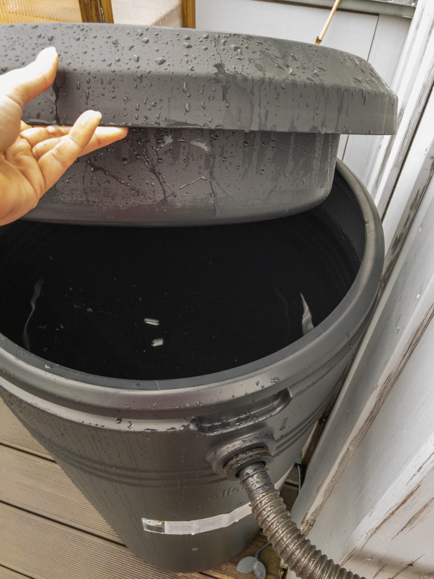 Nachtrag 2. März: Die Regentonne ist bereits komplett voll. Ich habe also gut gearbeitet – bin stolz. Jetzt kann ich den Deckel mit Kies auffüllen und bepflanzen.
