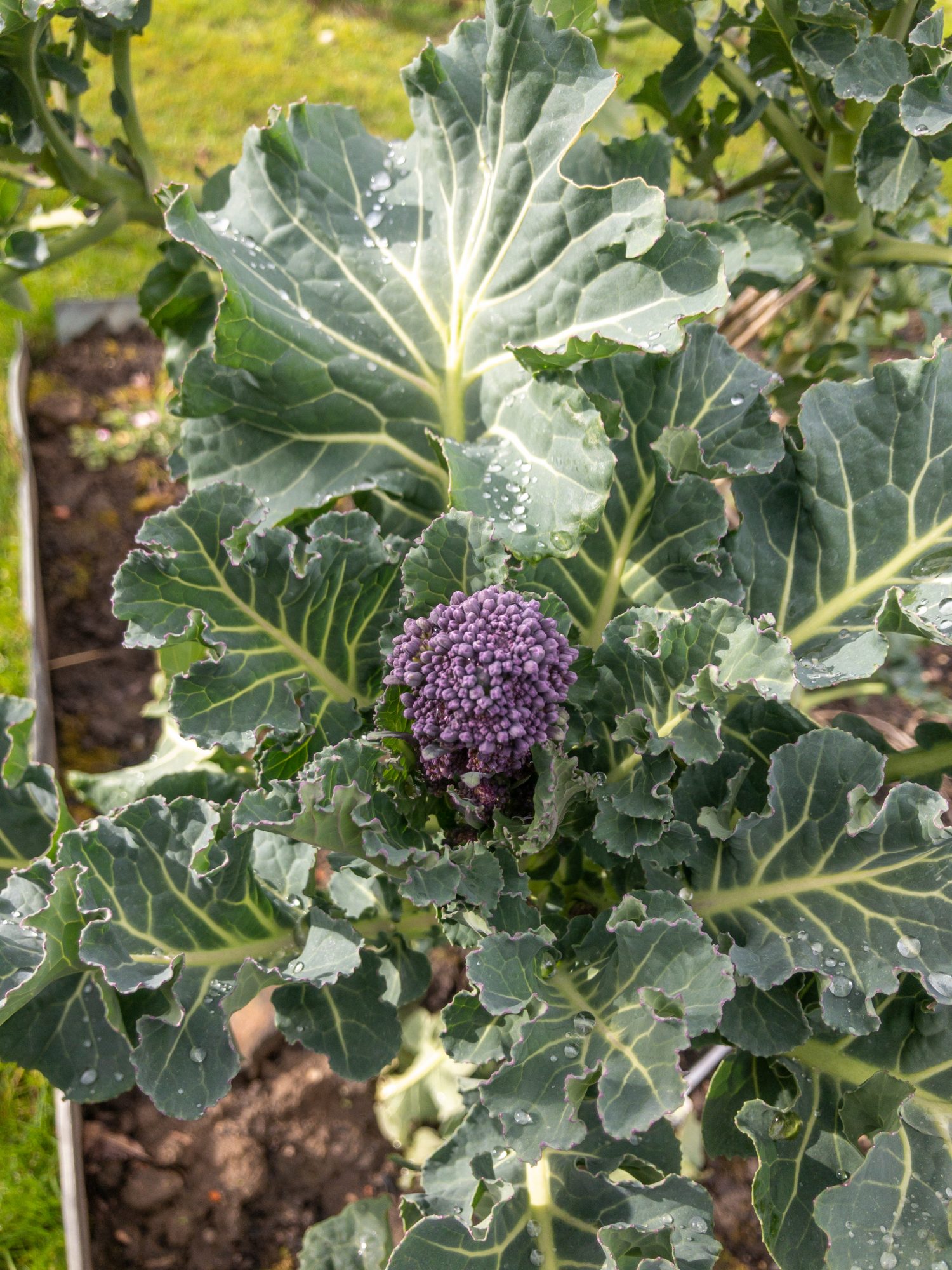 Der Lieblingskohl meiner Tochter ist Brokkoli. Klar, dass ich den auch selber ziehen muss. Dafür habe ich mir Saatgut einer purpurnen Sorte aus Norfolk mitgebracht und im Frühjahr 2018 zum ersten Mal ausgesät. In den Irrungen und Wirrungen meiner nicht immer gut dokumentierten Anzucht ging das Schildchen verloren. Die Setzlinge habe ich aber doch ausgepflanzt.