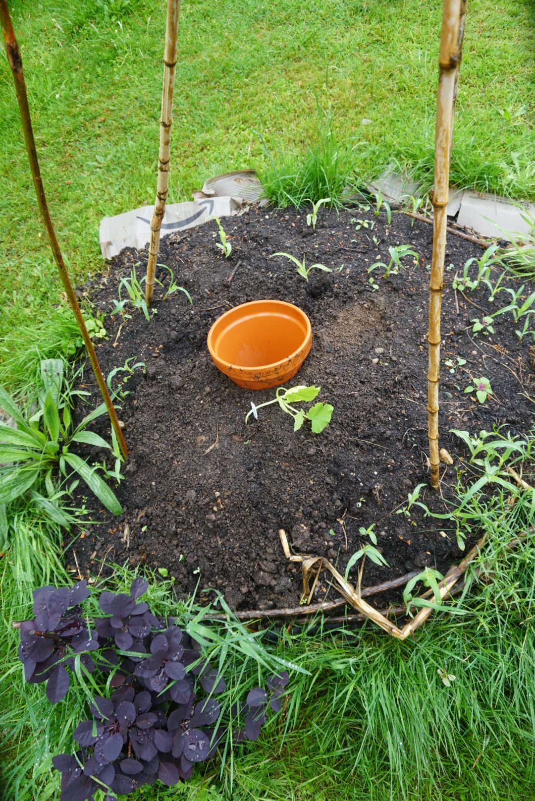 Da bin ich richtig froh, dass es heute endlich mal regnet. Regen ist eine gute Voraussetzung für das Gemüse um durchzustarten. Die oft noch zarten Würzelchen trocknen nicht aus und können sich gut im Boden verankern. Mais etwa geht ein, wenn er zu trocken steht in der ersten Zeit nach der Pflanzung. Ebenso Kürbis und Zucchini. Das schleppen der Gießkannen entfällt heute und wenn ich ehrlich bin, fällt mir bei dem kühleren Regenwetter das Arbeiten viel leichter.