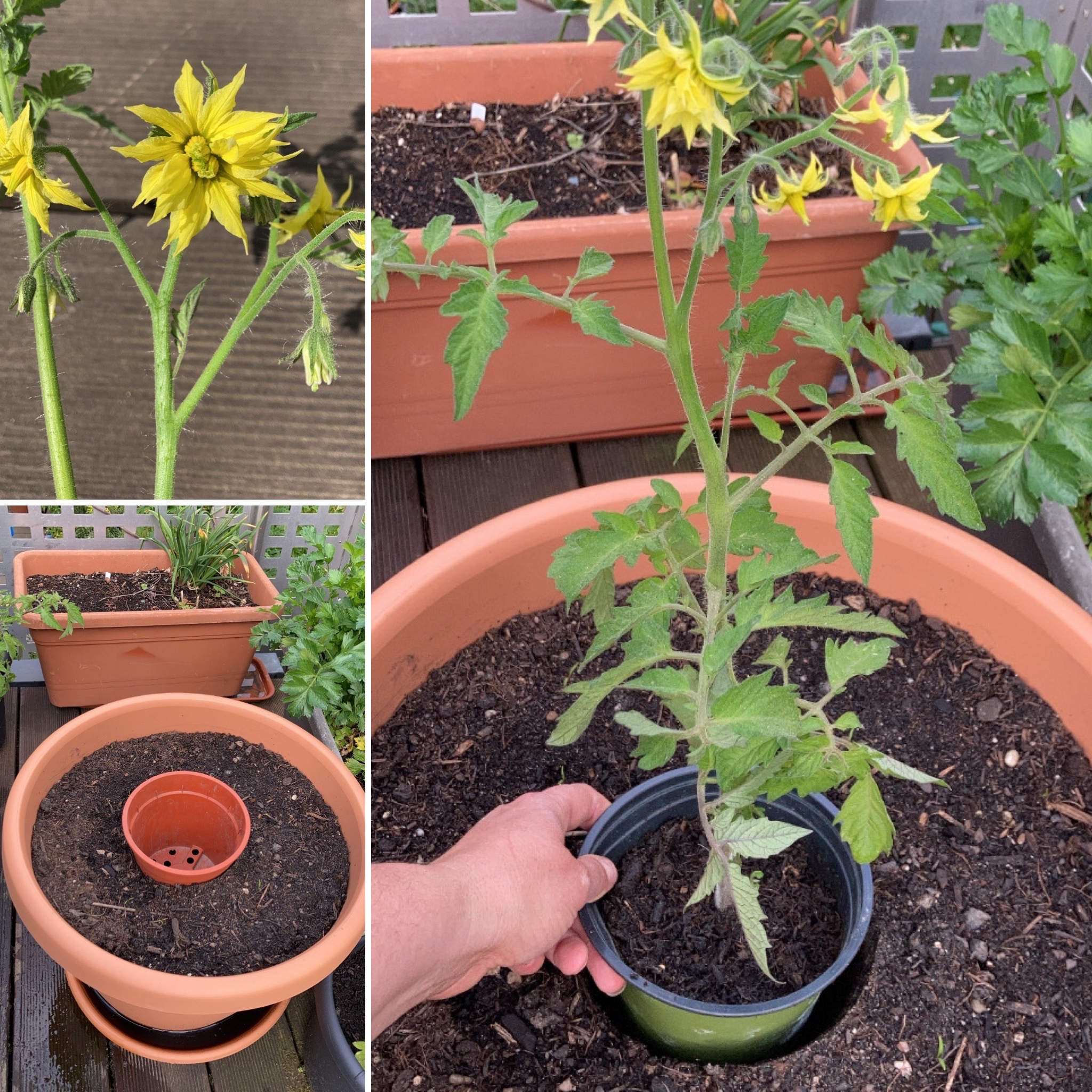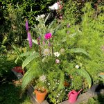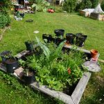 Ende März dann noch rote Sonnenblumen, Cosmeas, Erdbeermais und Zinnien. Selbst ausgesät hat sich auch hier der Erdbeerspinat. Knollen von Prachtscharte und Crocosmia habe ich ebenfalls gepflanzt. Die Dahlien sind erst im Mai mit eingezogen. Diese habe ich in einem geschützt stehenden Pflanztopf vorgezogen, damit ihnen der letzte Frost im Frühjahr nichts anhaben kann. Ich wende dafür einen kleinen Trick an. Beim Anlegen des Blumenbeetes setze ich einen gleich großen Blumentopf wie dem der Dahlie in die Erde. Darum herum säe und pflanze ich. Wenn dann die Dahlie einzieht, muss ich nur den leeren Blumentopf entfernen und den Ballen mit der Dahlie in das Loch gleiten lassen. Funktioniert auch mit anderen vorgezogenen Blumen und Stauden sehr gut.