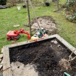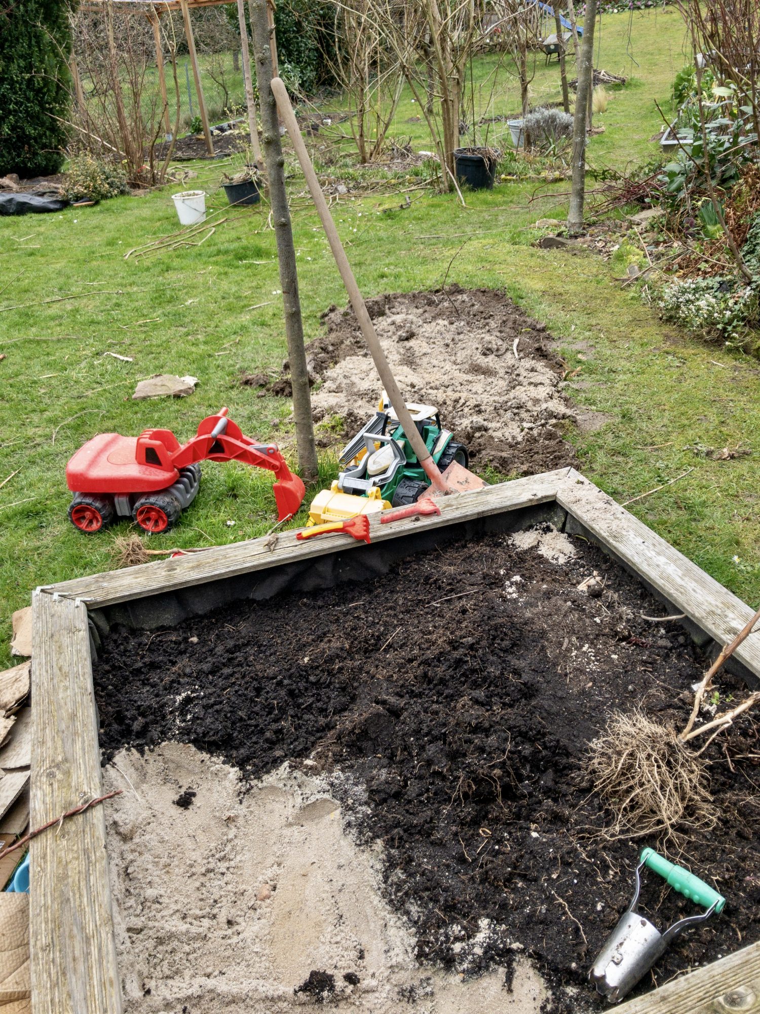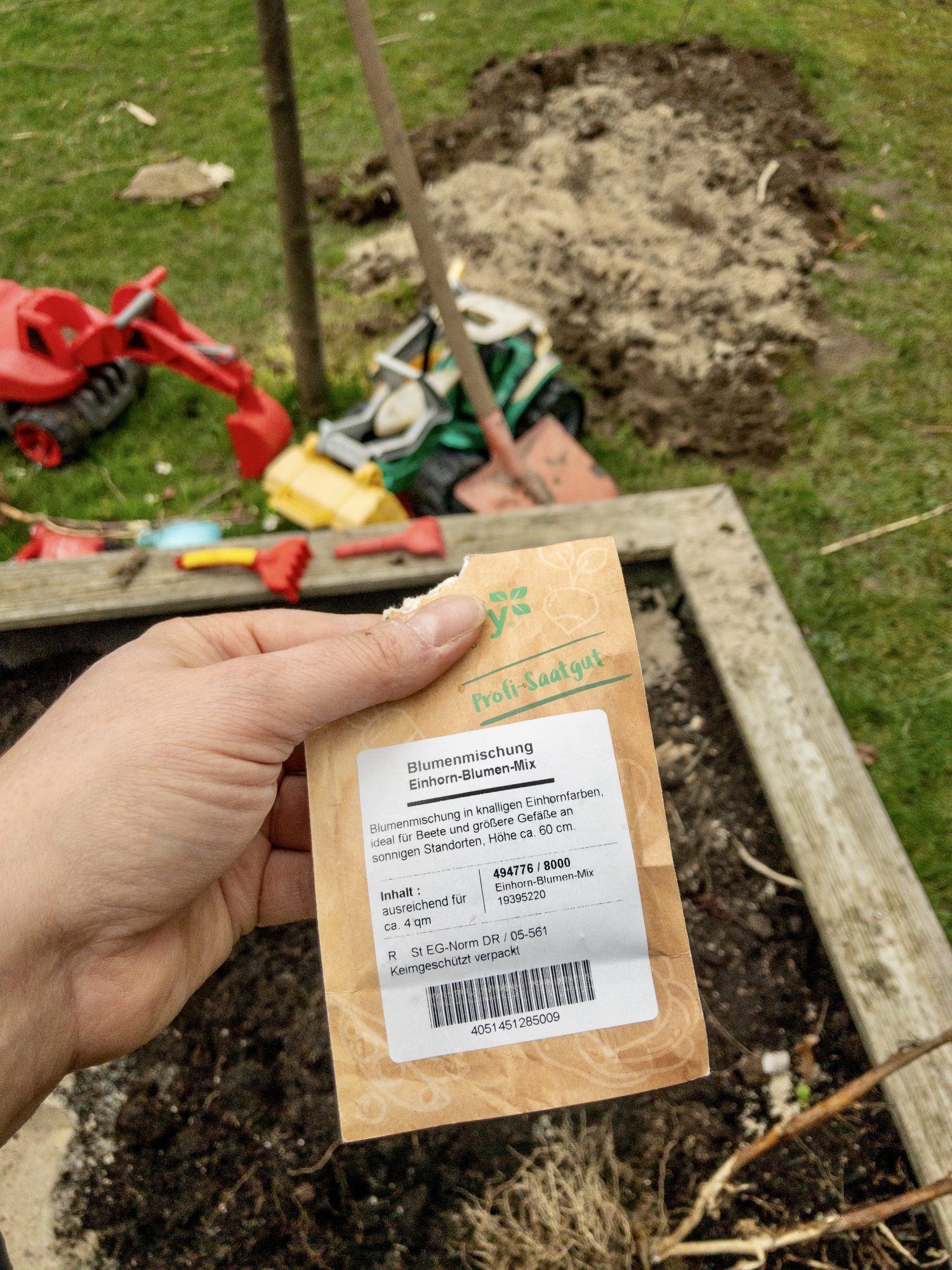Nach einer Rücksprache mit meinem Jüngsten hatte ich das „Go“ für das kleine Projekt. Ich habe es mir ganz einfach gemacht. Den Sand gut verteilt, darauf Blumenede aus den Säcken vom letzten Gartenjahr. In denen sind im letzten Sommer Paprika und Auberginen gewachsen. Es wird also alles wieder verwendet, ganz im Zeichen der Nachhaltigkeit. Noch nicht einmal Kompost habe ich beigefügt, da einjährige Blühpflanzen es etwas magerer brauchen als Gemüse.