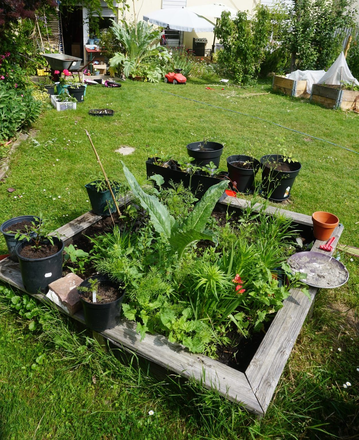 Zurück zum Garten. Das aller schönste Beet in diesem Sommer ist der ehemalige Sandkasten. Nach gerade einmal 4 Jahren Nutzung sind die Kids dem Sandkasten entwachsen. Im letzten Sommer lag er nur noch ungenutzt da, im Sand wuchsen bereits Pflanzen. Für mich war schnell klar, dass ich den Bereich als Blühfläche nutzen möchte. Blumen und Blüten gibt es einfach noch viel zu wenig im Hausgarten.