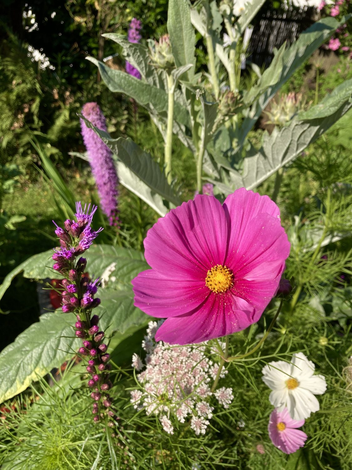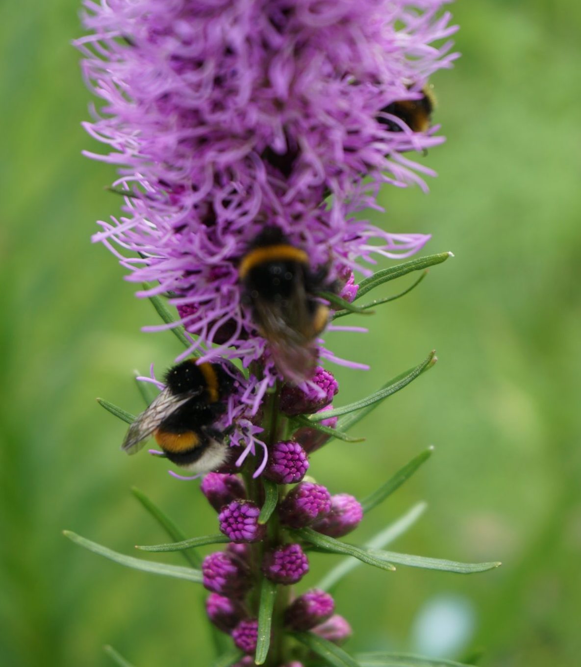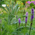 Mein persönlicher Favoriten in dem so neu entstandenen Blumenbeet sind die purpur farbenen Dolden der Prachtscharte. Die gefallen nicht nur mir besonders gut. Auch die Insekten – Allen voran Hummeln – sind regelrecht euphorisch, wenn sie sich durch die Dolden wuhlen.