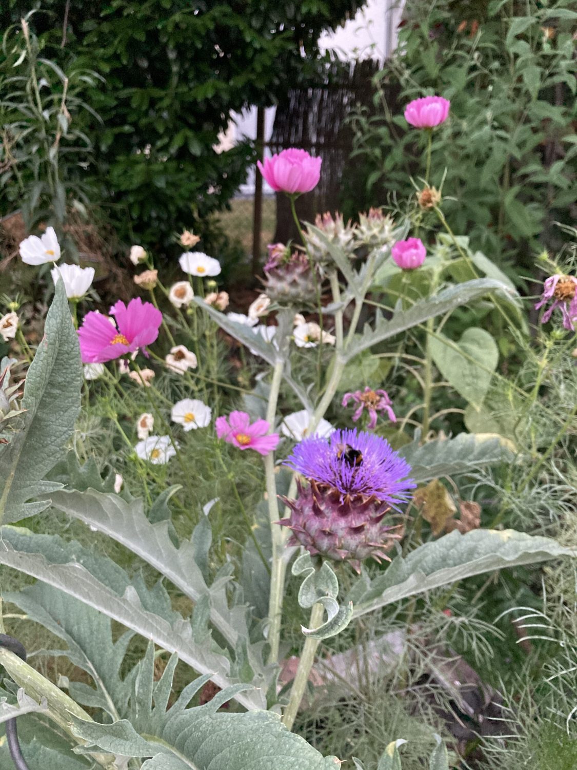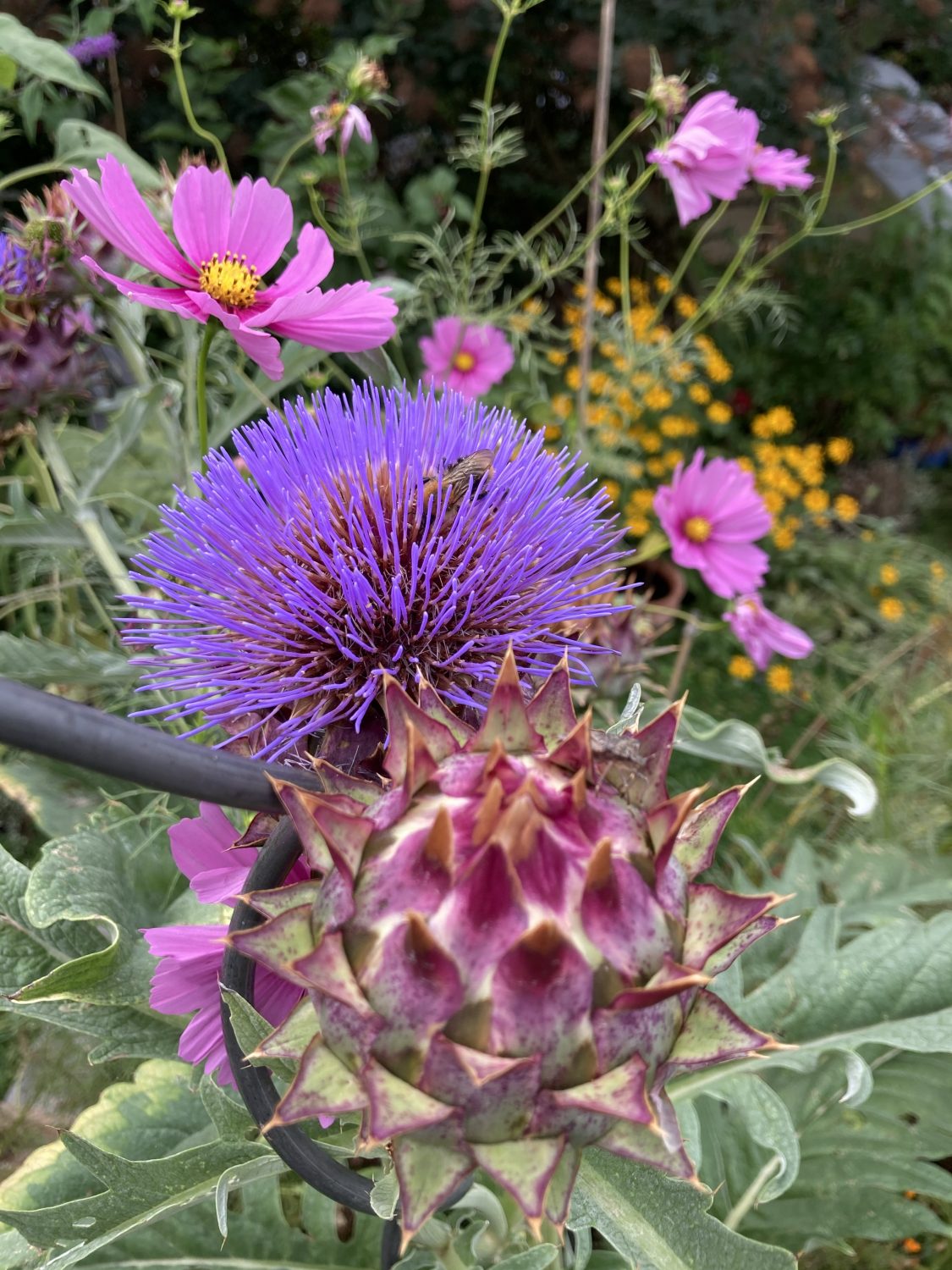 Zwischen all den Blumen habe ich auch selbst vorgezogenes Gemüse angepflanzt. Als Prachtstück kam in die Mitte ein Cardy. Der ist inzwischen riesig und verdeckt fast die roten Sonnenblumen. Dazwischen sitzen noch ein Palmkohl und Mangold. So ist das Beet nicht nur schön, sondern auch nützlich.