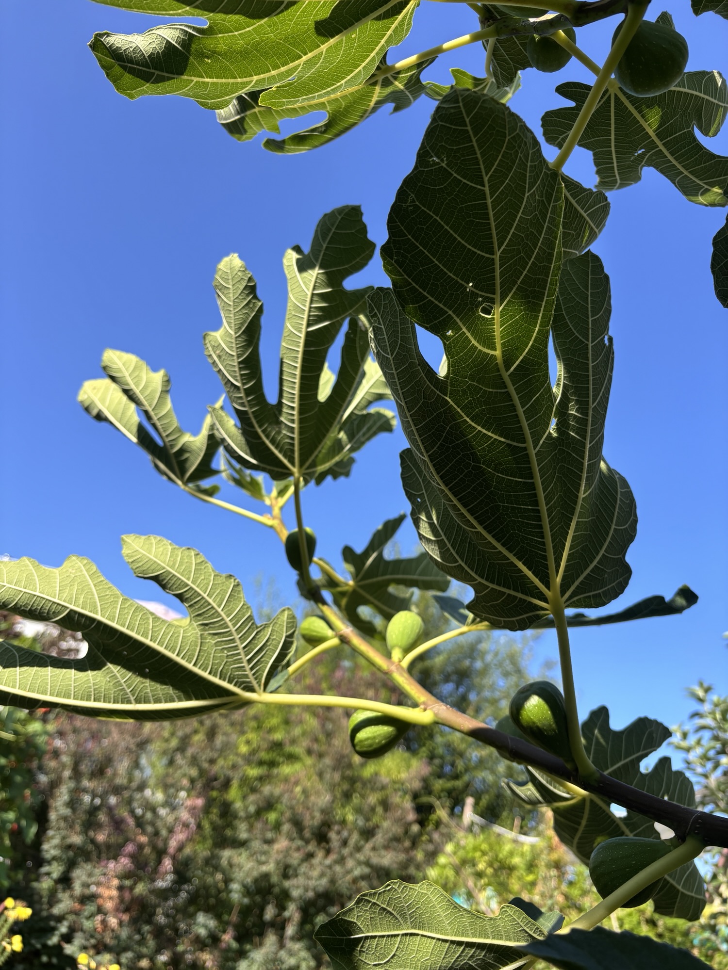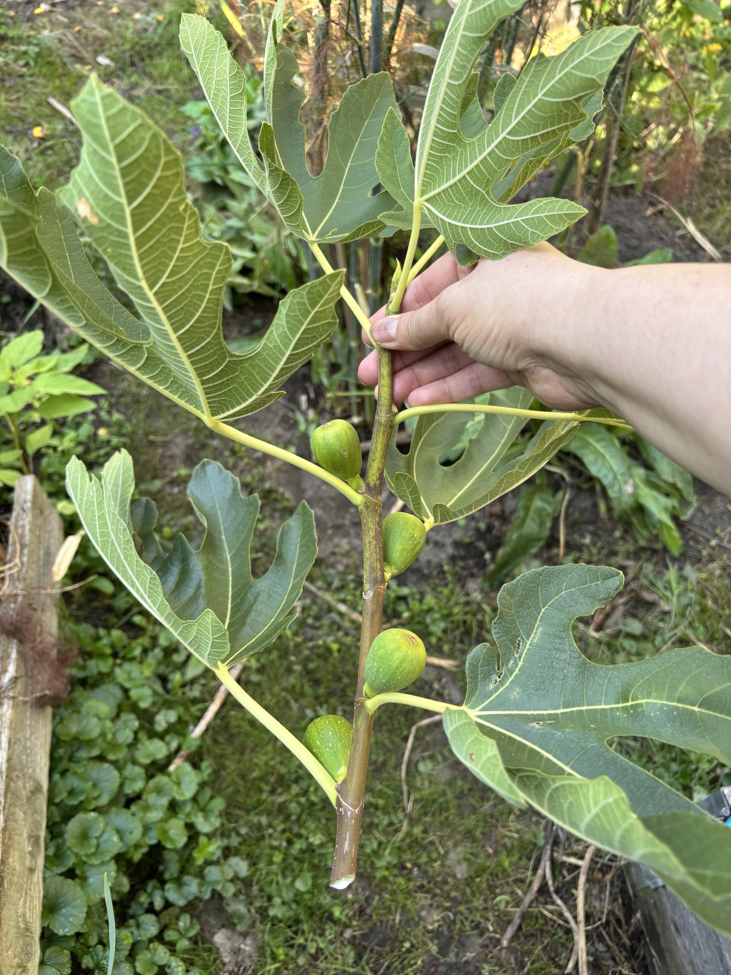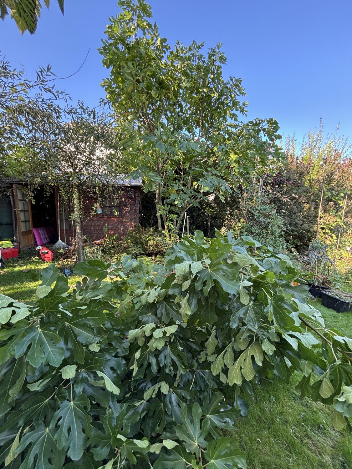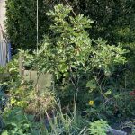 Richtig überrascht war ich über die ersten Anzeichen einer Feige neben der Gartenhütte. Auf einmal wuchs hier ein Feigenbaum hoch. Dieser hatte lange keine Früchte, ist aber innerhalb zwei Jahren auf eine Größe von fast 3 Meter in 2022 hoch gewachsen. 2024 hat dieser Feigenbaum locker die 5 m Marke geknackt. Auch zeigten sich ganz viele Fruchtansätze. Leider hat sich der Feigenbaum selbst überschätzt.