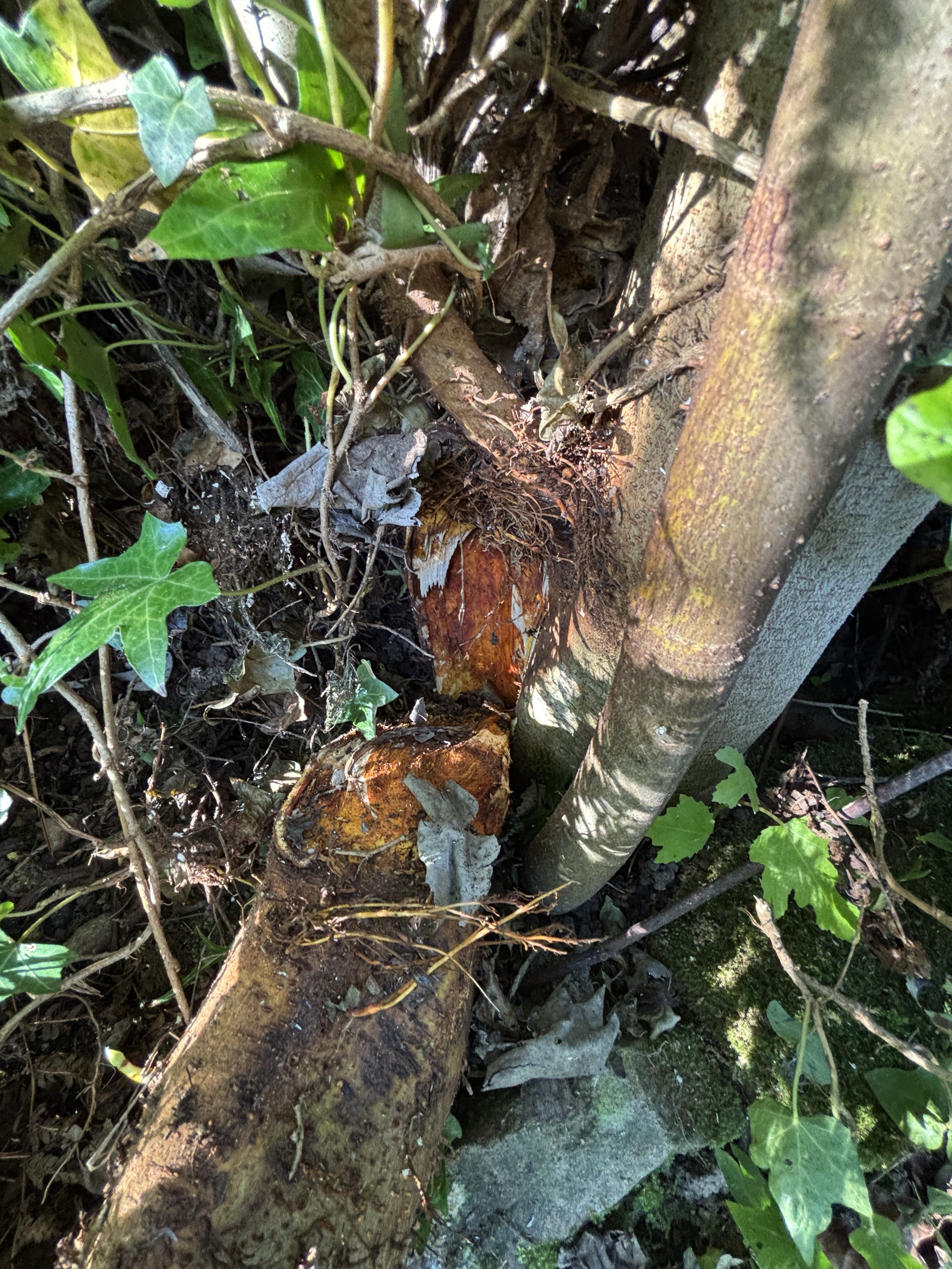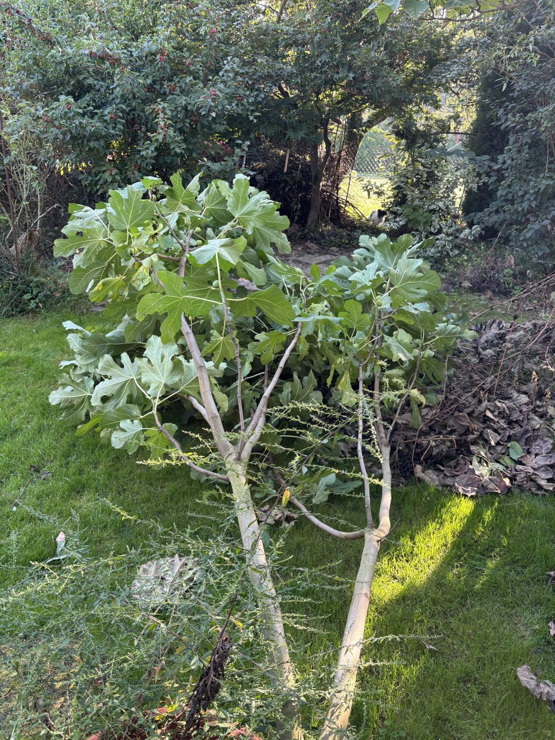 An einem warmen September Tag lag auf einmal die Hälfte des Feigenbaumes an der Gartenhütte auf dem Rasen. Er war unten, direkt oberhalb der Wurzel auseinander gebrochen. Ich hatte eh vor ihn zu stutzen – sein Schatten war einfach zu groß geworden. Doch mein Plan zu warten, bis die ganzen Feigen reif sind, ging nicht auf. Schade, denn dieser Baum liefert die leckersten Feigen von den drei Bäumen im Garten. Tja, man hat so seine Ideen, aber die Natur macht was sie will.