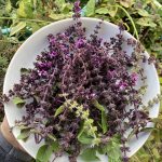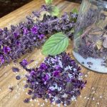 Im Herbst, wenn die Temperaturen für Basilikum zu kühl werden, schneide ich alle bereits verblühten Blütenstände ab. Ich nehme den Bienen also nichts weg, verwende nur das, was ansonsten weg geworfen wird. Die Blütenstände breite ich auf einem großen Teller zum trocknen aus, in der Nähe einer Heizung für rund 2 Wochen.