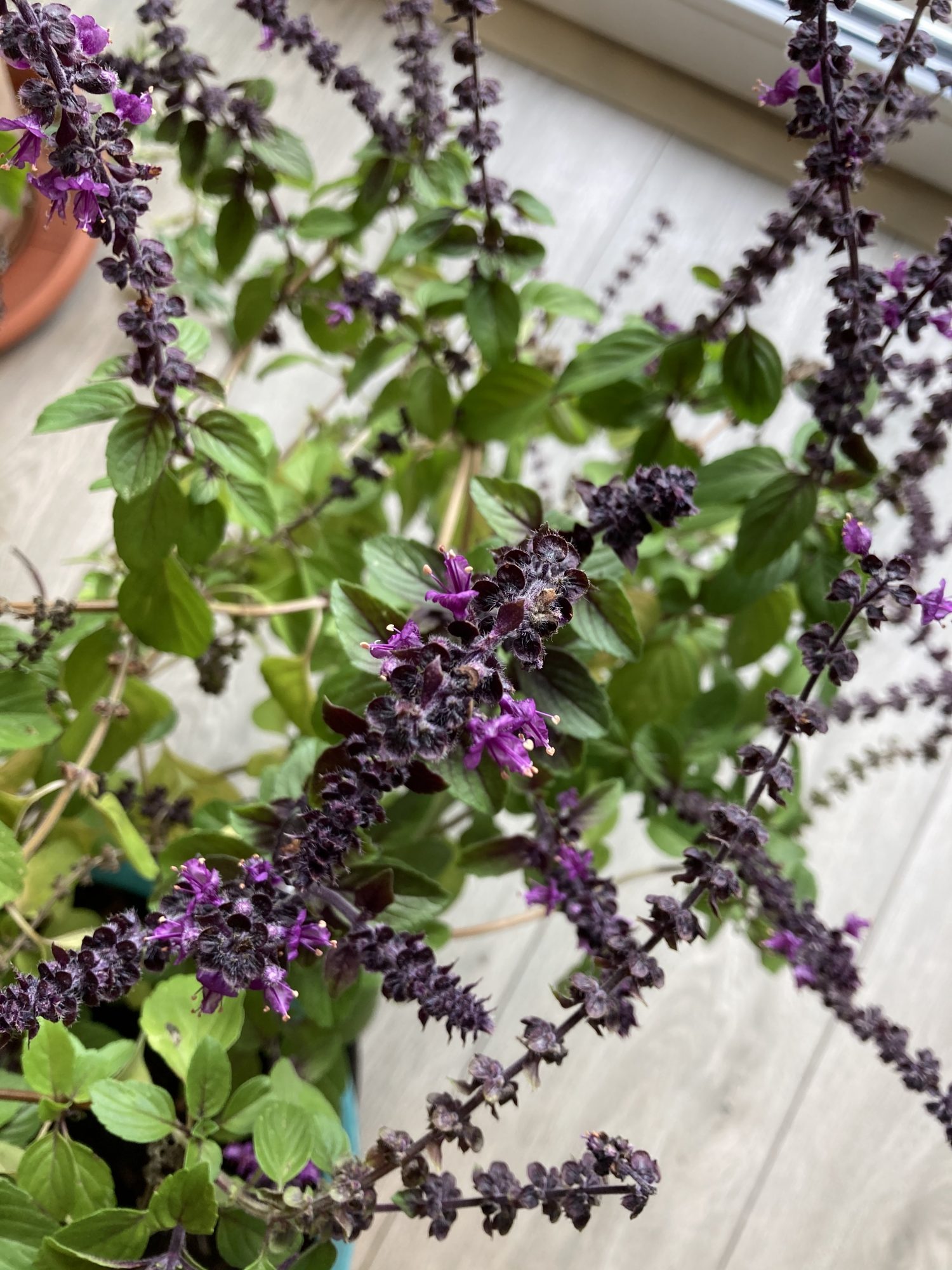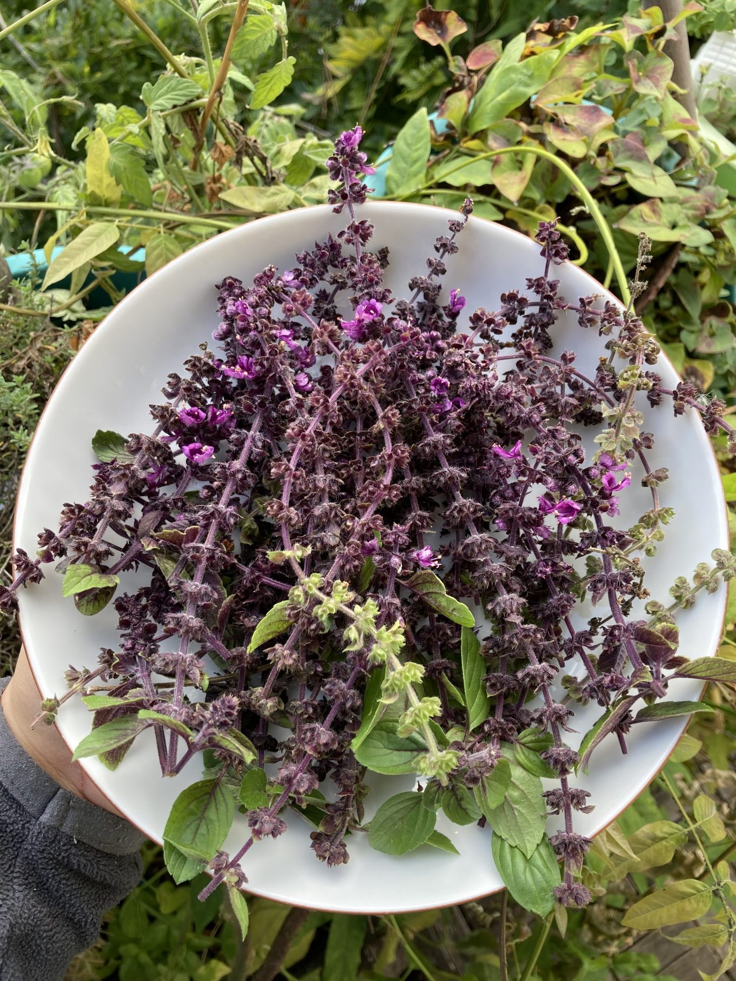 Im Herbst, wenn die Temperaturen für Basilikum zu kühl werden, schneide ich alle bereits verblühten Blütenstände ab. Ich nehme den Bienen also nichts weg, verwende nur das, was ansonsten weg geworfen wird. Die Blütenstände breite ich auf einem großen Teller zum trocknen aus, in der Nähe einer Heizung für rund 2 Wochen.