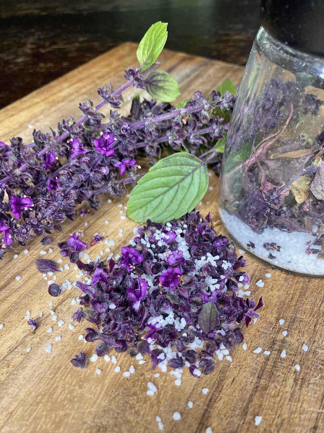 Gut getrocknet lassen sich die Blütenstände ganz einfach von den Stängel abstreifen. Diese Prozedur liebe ich sehr, denn danach duftet das ganze Zimmer nach herrlich, aromatischem Basilikum. Nun noch mit grobem Meersalz vermengen und in eine Gewürzmühle füllen. So kommt der Geschmack des Sommer auch im Winter auf eine selbst gemachte Pizza. Die Menge von einem Basilikum Busch reicht in der Regel bis zum nächsten Frühjahr.