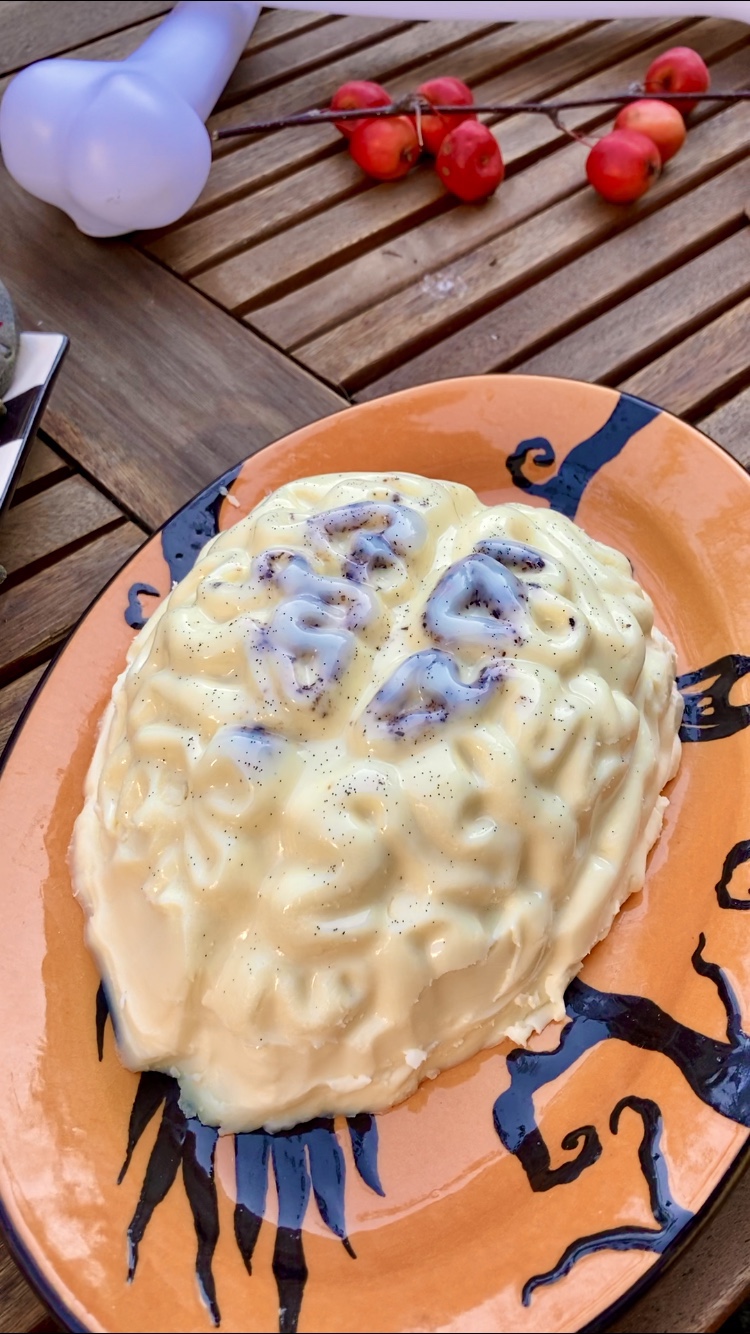 Nun haben wir aber das Hirnrezept gefunden, dass wirklich superlecker ist: Eine Tonka Panakotta mit Basilikumsoße. Unfassbar lecker und sieht auch wirklich gruselig aus. Das Gehirn kann natürlich auch mit roter Soße dekoriert und verzehrt werden. Beispielsweise einer Himbeersoße. Aber ich bevorzuge die Basilikumsoße. Jetzt wünsche ich euch Allen ein schönes Halloween und viele Süßigkeiten.