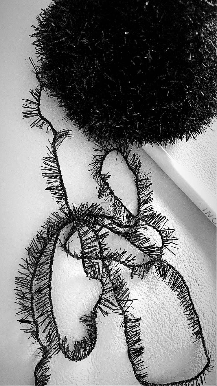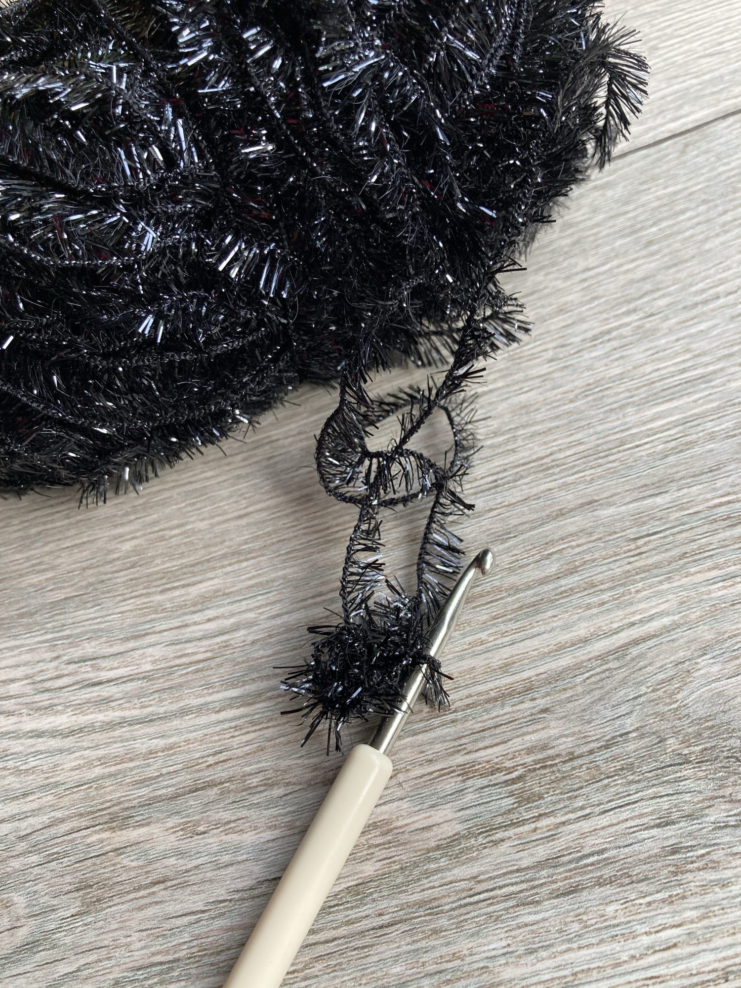 Als Drittes gibt es eine große Schwarze Spinne. Der Körper ist gehäkelt mit einem speziellen, schwarzen Schwammgarn. Es wird normalerweise für das Häkeln von Spülschwämmen benutzt. Als Spinnenkörper kommt es aber auch ganz cool. 4 Maschen anschlagen, dann mehrere Runden – je nach Größe des Spinnenkörpers – jede zweite Masche doppelt häkeln. Ist der Körper ausreichend groß, die Maschen wieder abnehmen. Den Körper mit Watte ausstopfen und schließen. Die Pfeifenputzer einfach durch den Körper schieben. Augen aufkleben – fertig.