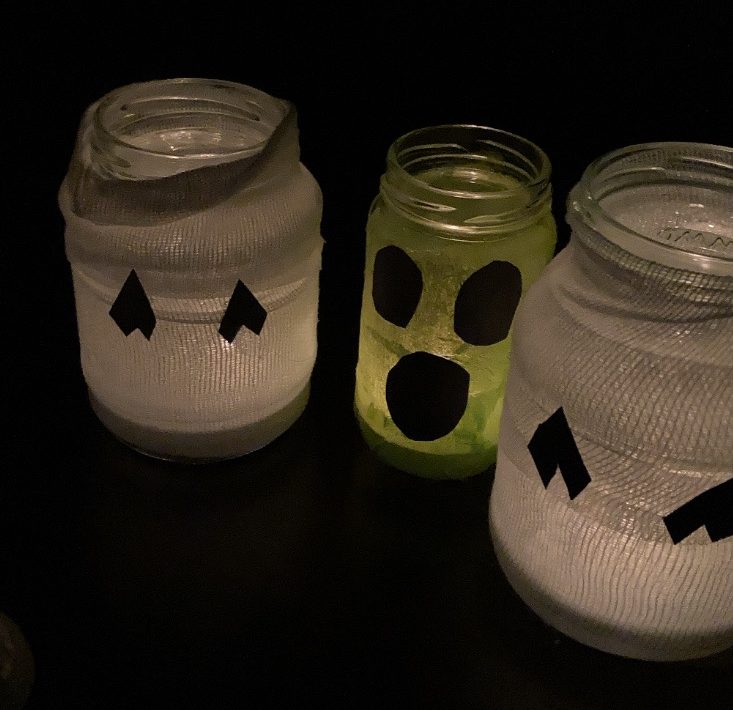 Das zweite Projekt sind die Mumiengläser. Dafür habe ich Mullbinden / Verbandsmaterial mit einem speziellen Kleber auf alte Gläser aufgeklebt. Einfach und schnell gemacht. Das grüne Glas ist mit grünem Krepppapier gemacht. Der übliche Serviettenkleber klebt super. Augen und Mund sind aus Tonpapier. Und schon ist die Stimmung wieder etwas gruseliger.