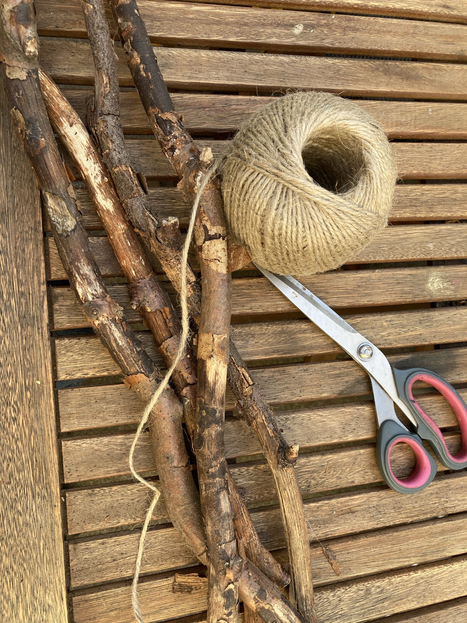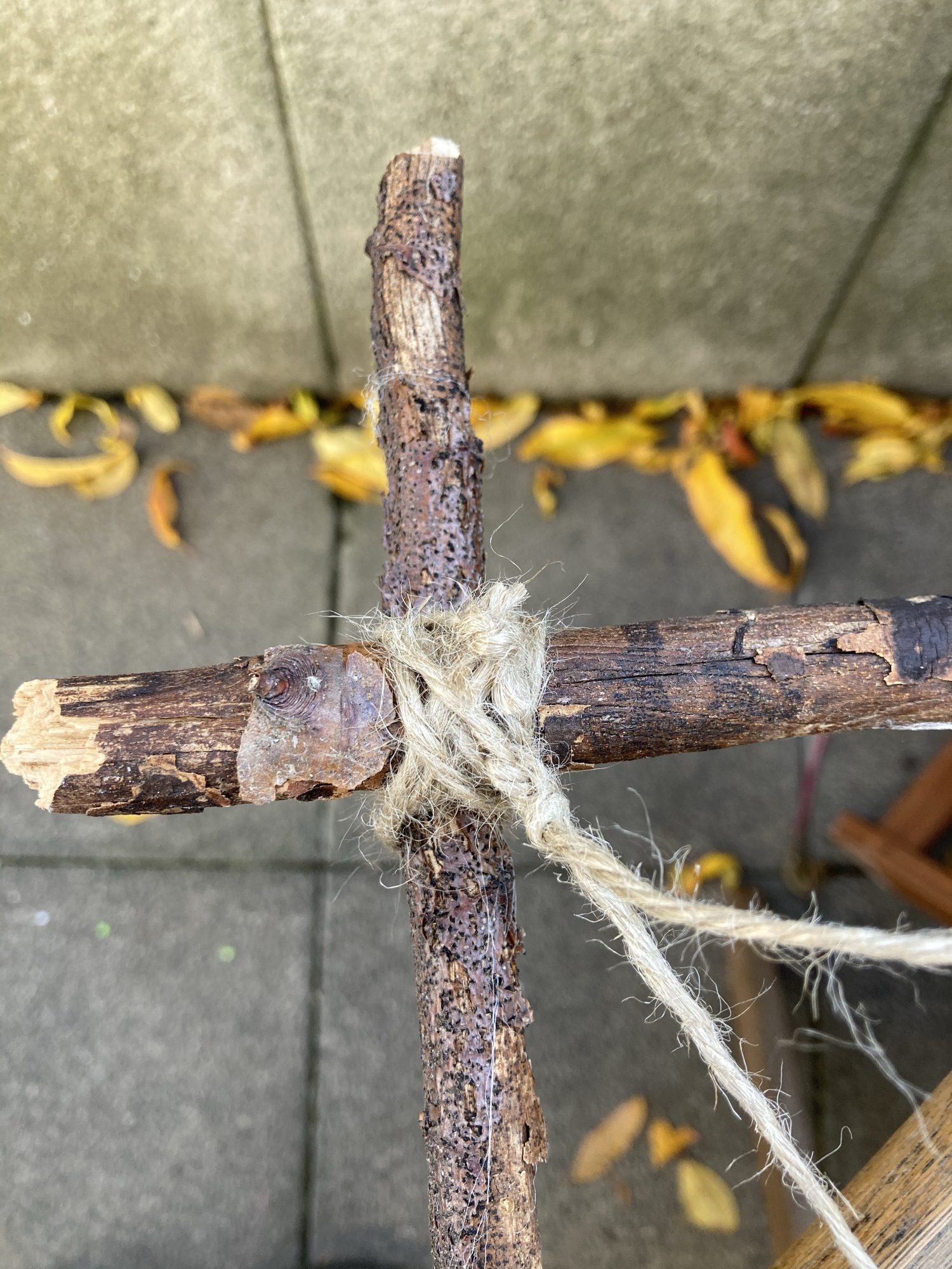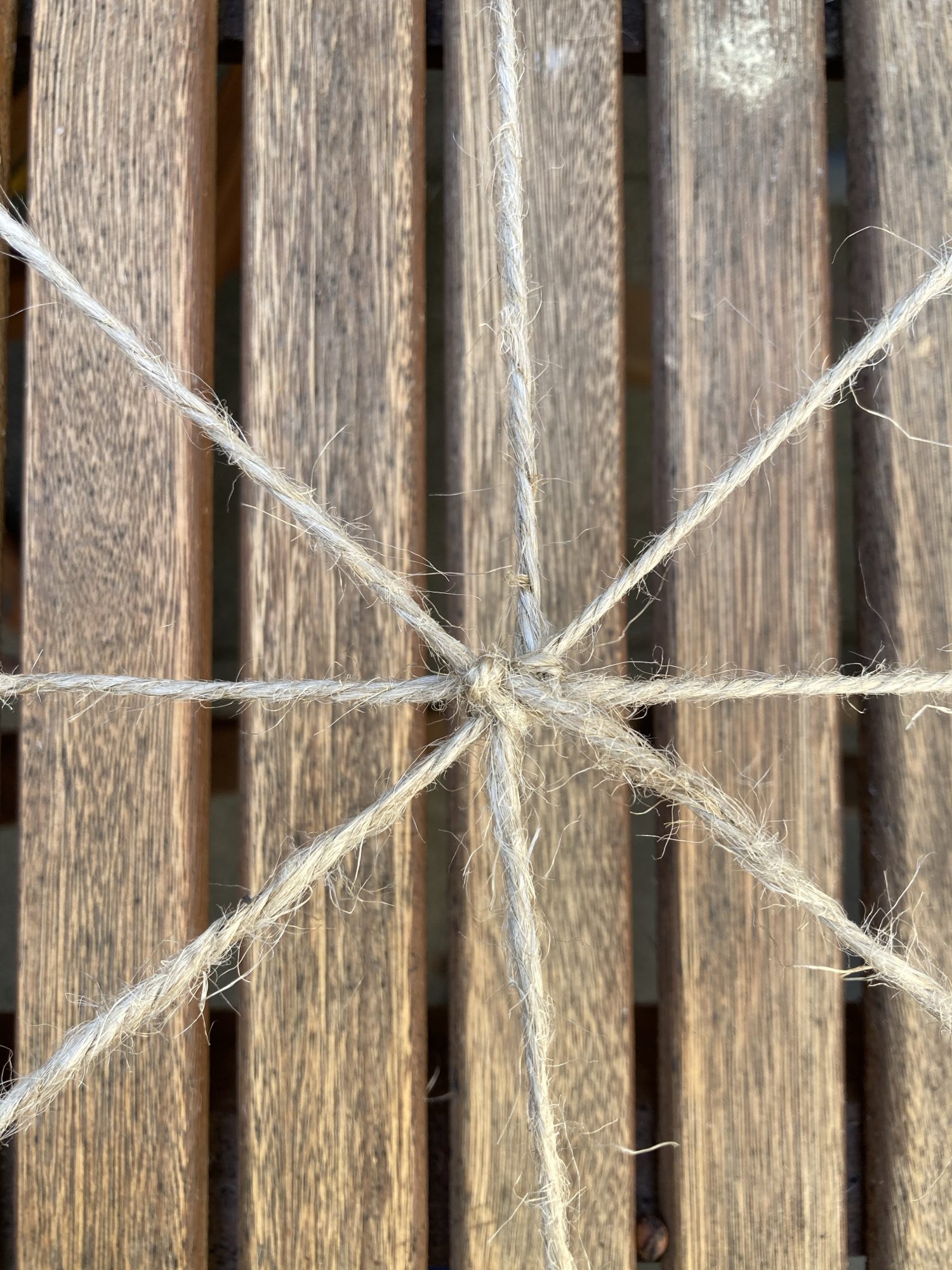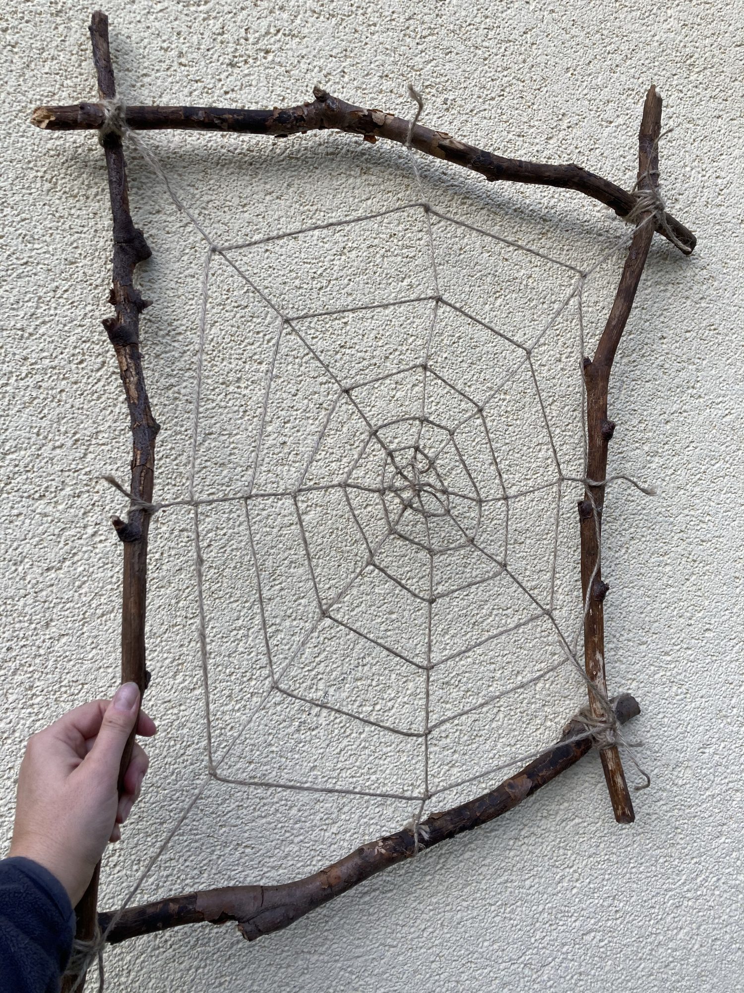Vier relativ gleich lange, knorrige Äste werden zu einem Rahmen fest gezurrt. Vier Schnüre überkreuzt, dann wird von der Mitte aus rund herum gefädelt und immer gut fest geknotet. Nach 6 Runden sieht es schön gruselig aus.