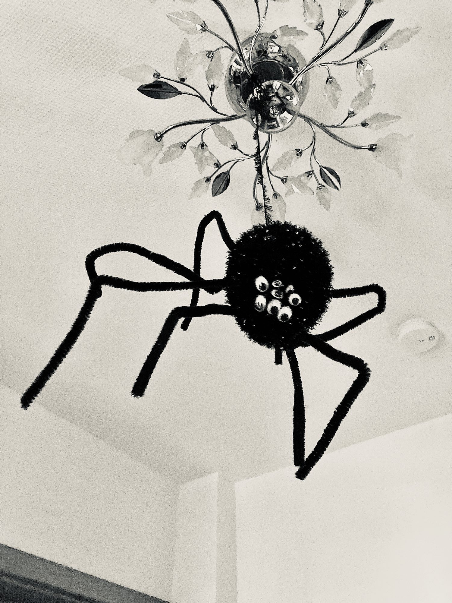 Die Spinne habe ich bereits letztes Jahr aus einer alten Styroporkugel, Drahtresten und schwarzen Bällchen zusammen geklebt. Passt super rein, sie hat hier ihre Bestimmung gefunden. Schnell gemacht, super günstig und schön gruselig. Ich liebe Halloween.