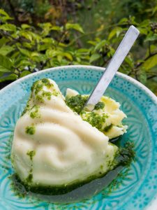 - Frisch gezupfte Basilikumblätter, Zitronensaft und etwas Zucker mit einem Pürierstab gut durchmixen.