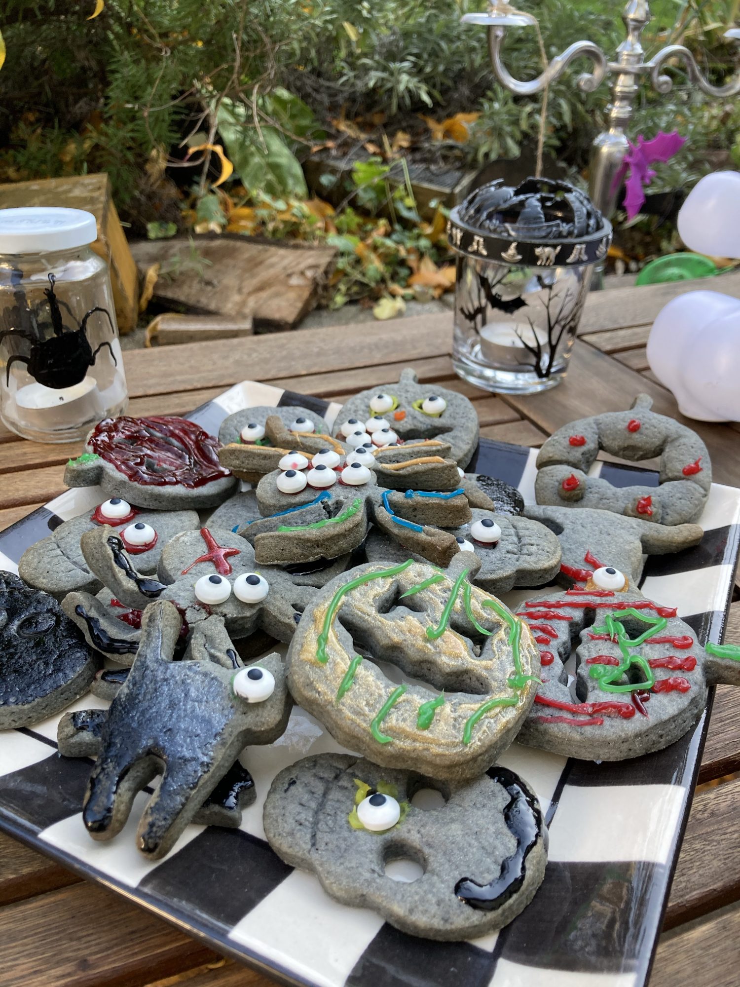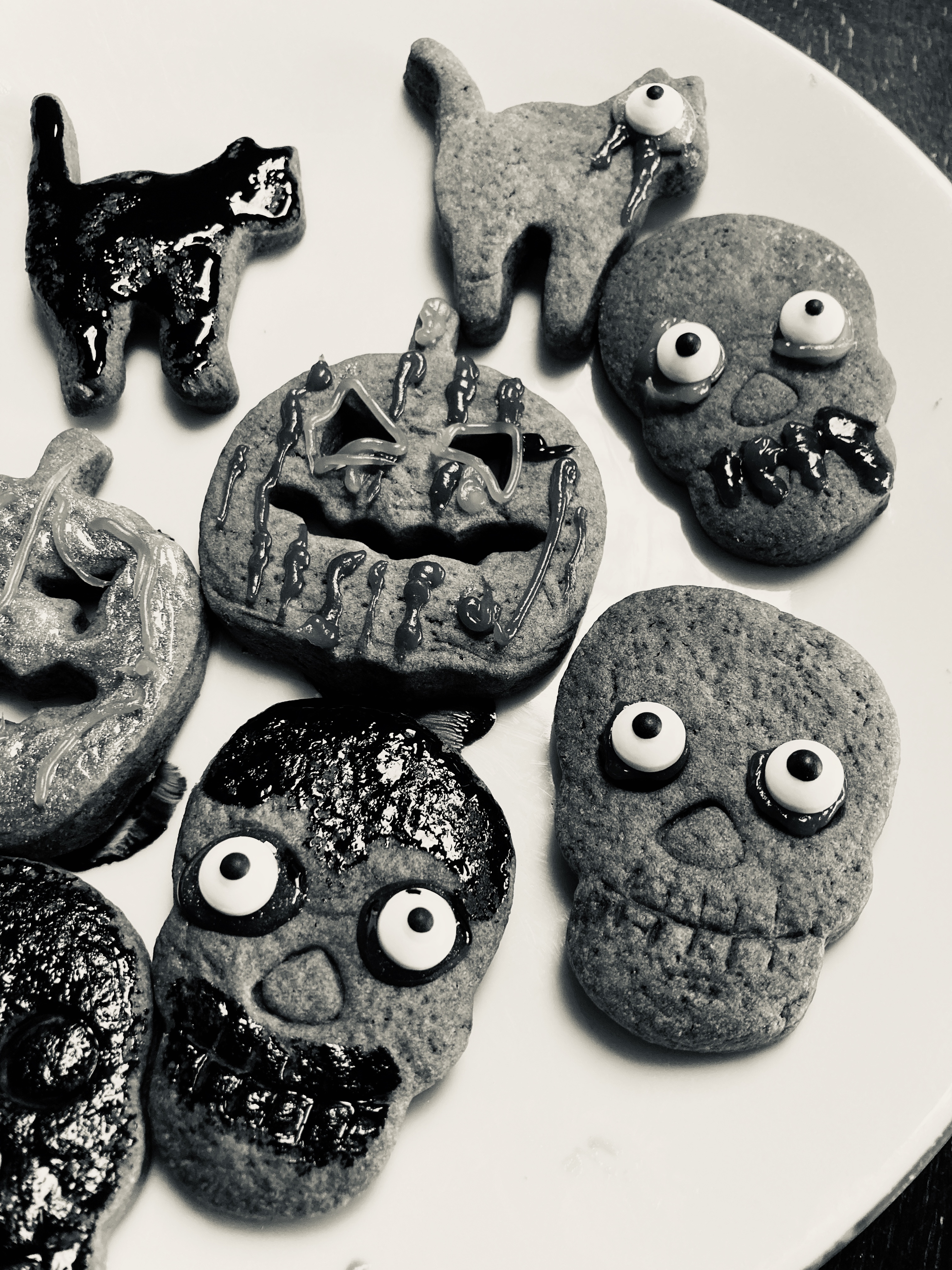Jetzt wird es lecker. Die beiden letzten Projekte für Halloween sind Gruselkekse und ein Gehirn … klar, aus Pannacotta. Die Kekse sind aus dem ganz normalen Butterkeksteig. Nur mit schwarzer Lebensmittelfarbe, besonderen Halloween Ausstechern und gruselig verziert. Sie sind inzwischen ein echter Klassiker auf unseren Kinderparties und werden von allen mit viel Liebe in der Woche vor Halloween gebacken und „aufgehübscht“. Für Erwachsene haben wir auch schon mal die Käsige Variante gemacht, siehe Hexenfinger.