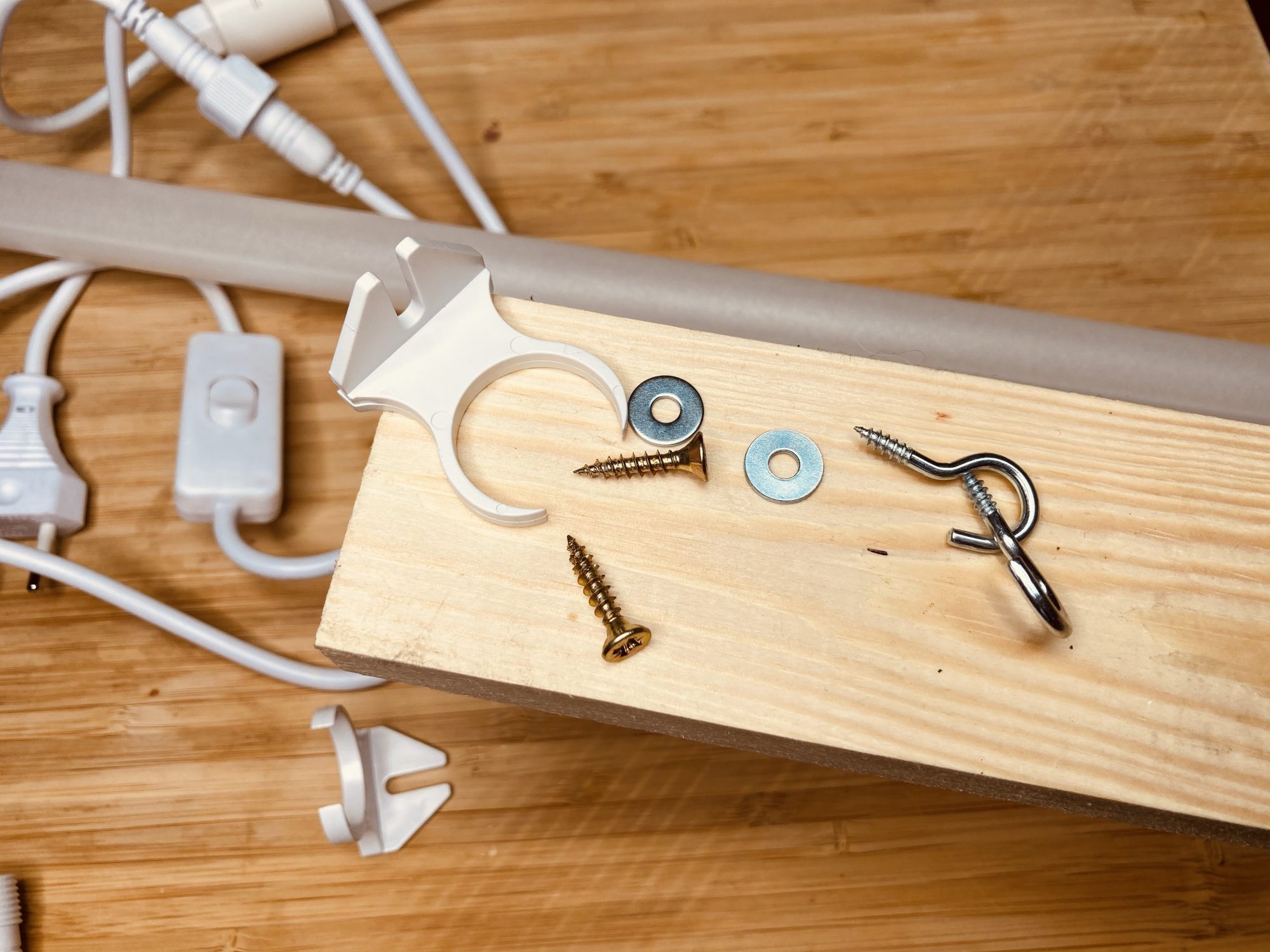 Jetzt habe ich die Leuchtröhren, aber noch nicht die passende Halterung dafür. Heute Vormittag habe ich die Lager geplündert und mit Restbeständen eine erste Halterung für eine Lichtröhre zusammen gebastelt. Holzlatte, Holzschrauben, Unterlegscheiben und Haken sind von anderen Bauprojekten übrig geblieben und kommen jetzt zum Einsatz.