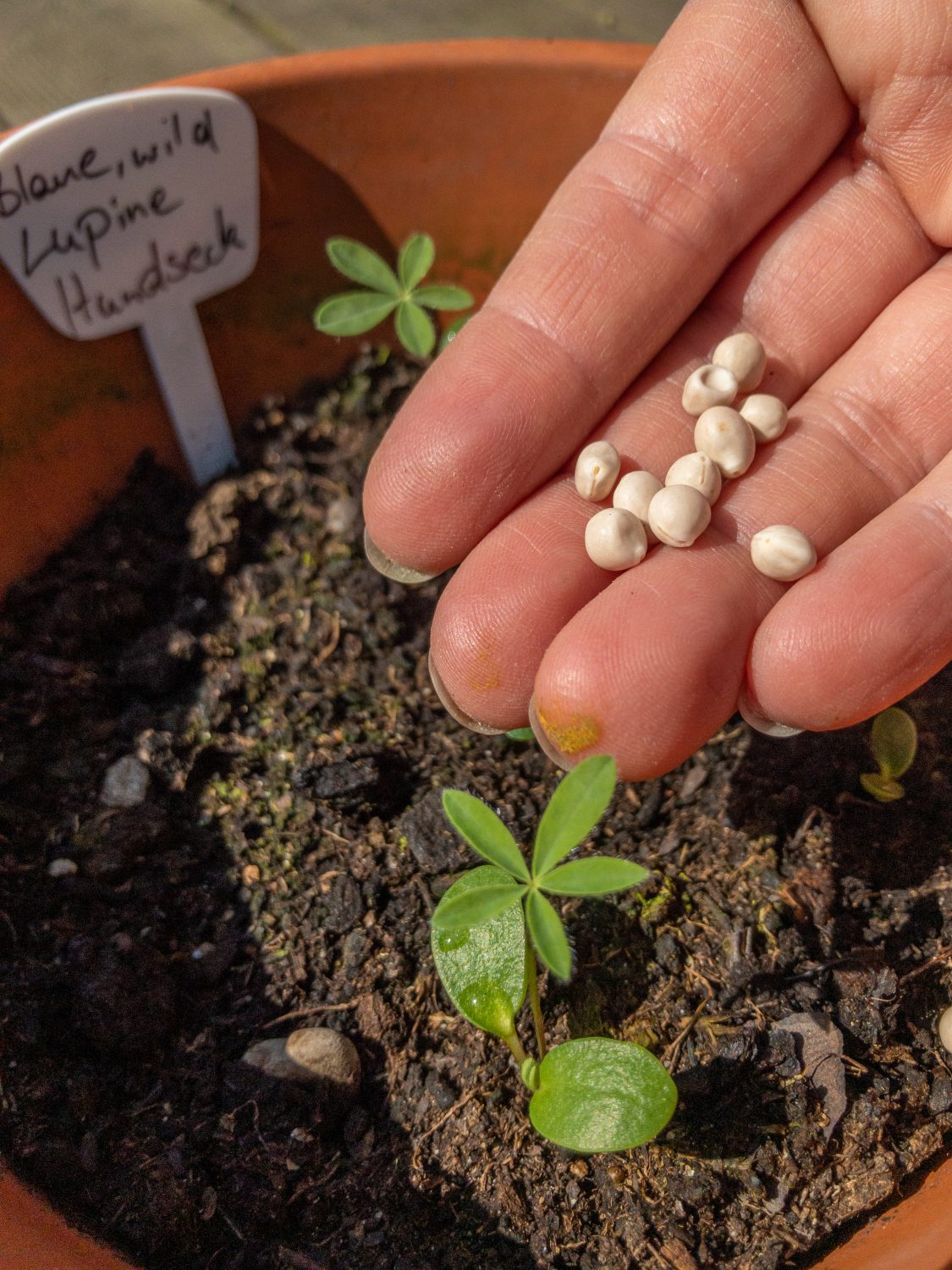Erkennt ihr die Blätter von kleinen Lupinen? Ich behaupte jetzt ganz frech, dass können nicht sonderlich viele Menschen. Wie soll ich dann diesen Menschen erklären, dass hier ganz besondere Blumen sitzen, die einfach ihre Zeit brauchen, bis sie sich entfalten? Die Samen dieser wilden Lupinen Art hatte ich bei einem wunderschönen Spaziergang mit meiner Familie gesammelt. Oben im Schwarzwald, am Fuß der Sprungschanze am Hundseck. Wenn ich diese kleinen Blätter sehe, dann erinnere ich mich an diesen Spaziergang, an den tollen Tag, das strahlende Blau der Lupinen.