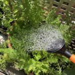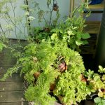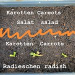 Im großen Hochbeet habe ich bereits Spargelsalat, Rübchen und Beete eingesät. In das kleine Hochbeet erst einmal nur eine Reihe Asia Salat. Die Samen hiervon habe ich im letzten Jahr fleißig gesammelt, er ist einfach so lecker. Die Erfahrung hat gezeigt, dass er hier bereits jetzt gut wächst. Später wird es zu warm im Balkongarten und er geht sofort in die Blüte.