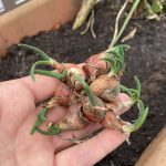 Uih, da hat sich doch ein Bündel Etagenzwiebeln hinter dem kleinen Rollcontainer versteckt. Die kommen jetzt in einen größeren Pflanztopf, in den ich auch gleich noch Samen des „Walking Stick Kale“ einsäe. Den ziehe ich hier vor, will aber nur den stärksten Setzling hier wachsen lassen. In einem weiteren Rollcontainer stecke ich noch einige Puffbohnen.