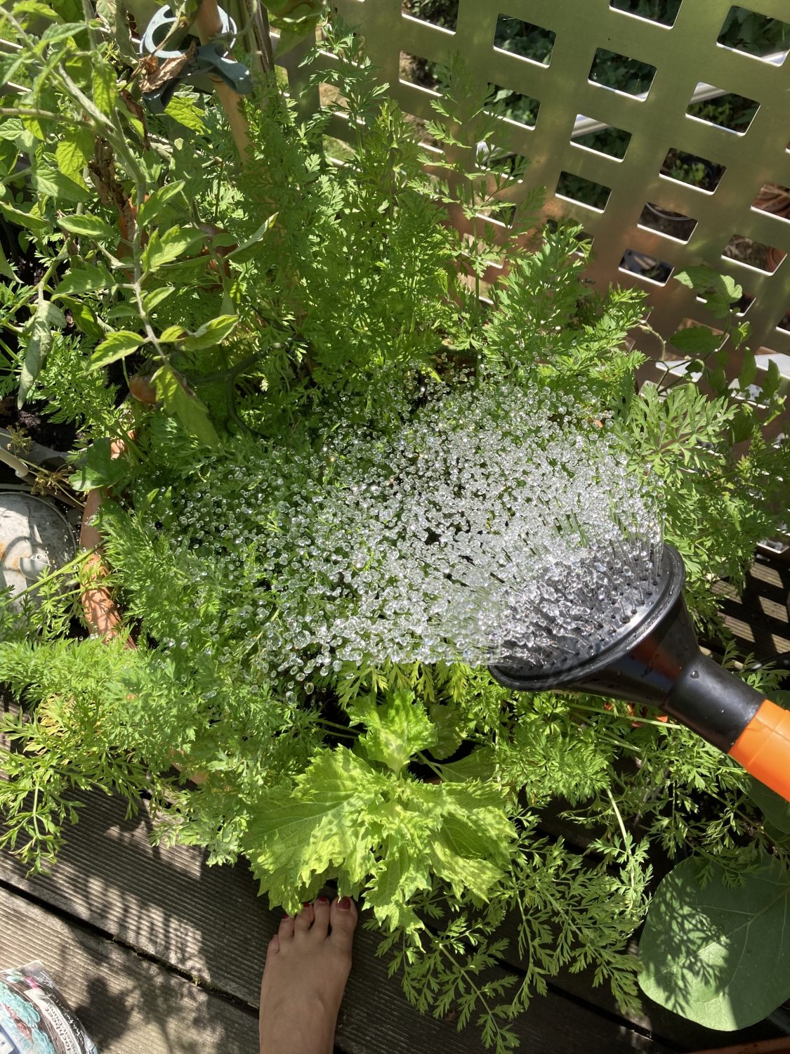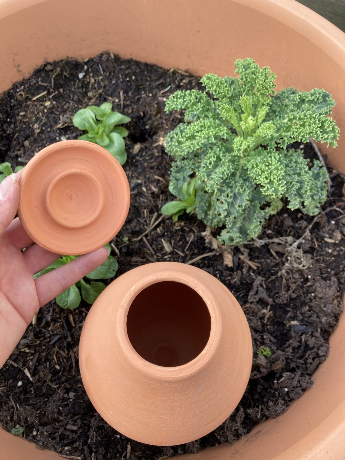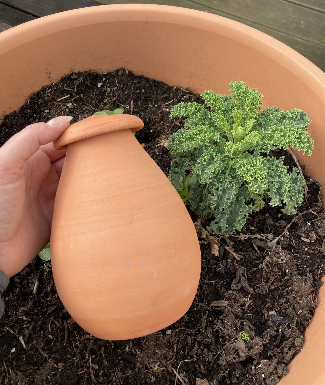 Ganz besonders stolz bin ich in diesem Jahr auf meine neueste Errungenschaft: Kleine Ollas, unglasierte Tongefäße, welche bis zum Hals in die Erde eingegraben werden. Diese Größe passt hervorragend in die Pflanzkübel und Container.Sie geben, befüllt mit Wasser, im Sommer kontinuierlich Flüssigkeit in die umgebende Erde ab. Nicht zuviel und nicht zu wenig. Genau das richtige für Gurken, Kürbis und Tomaten. So können die Trockenschäden im Balkongarten endlich vermieden werden. Die Tontüllen haben den gleichen Effekt, können aber immer nur eine Pflanze versorgen.