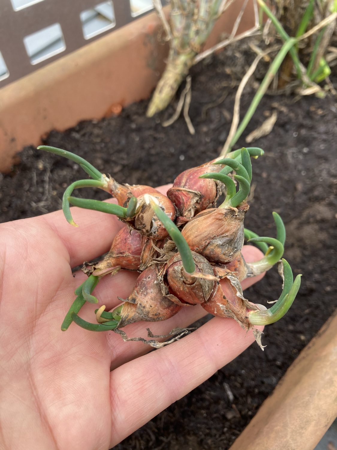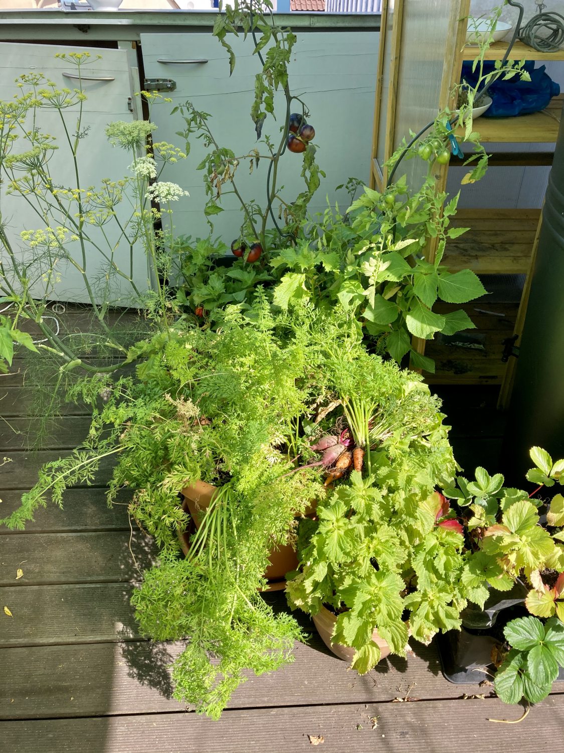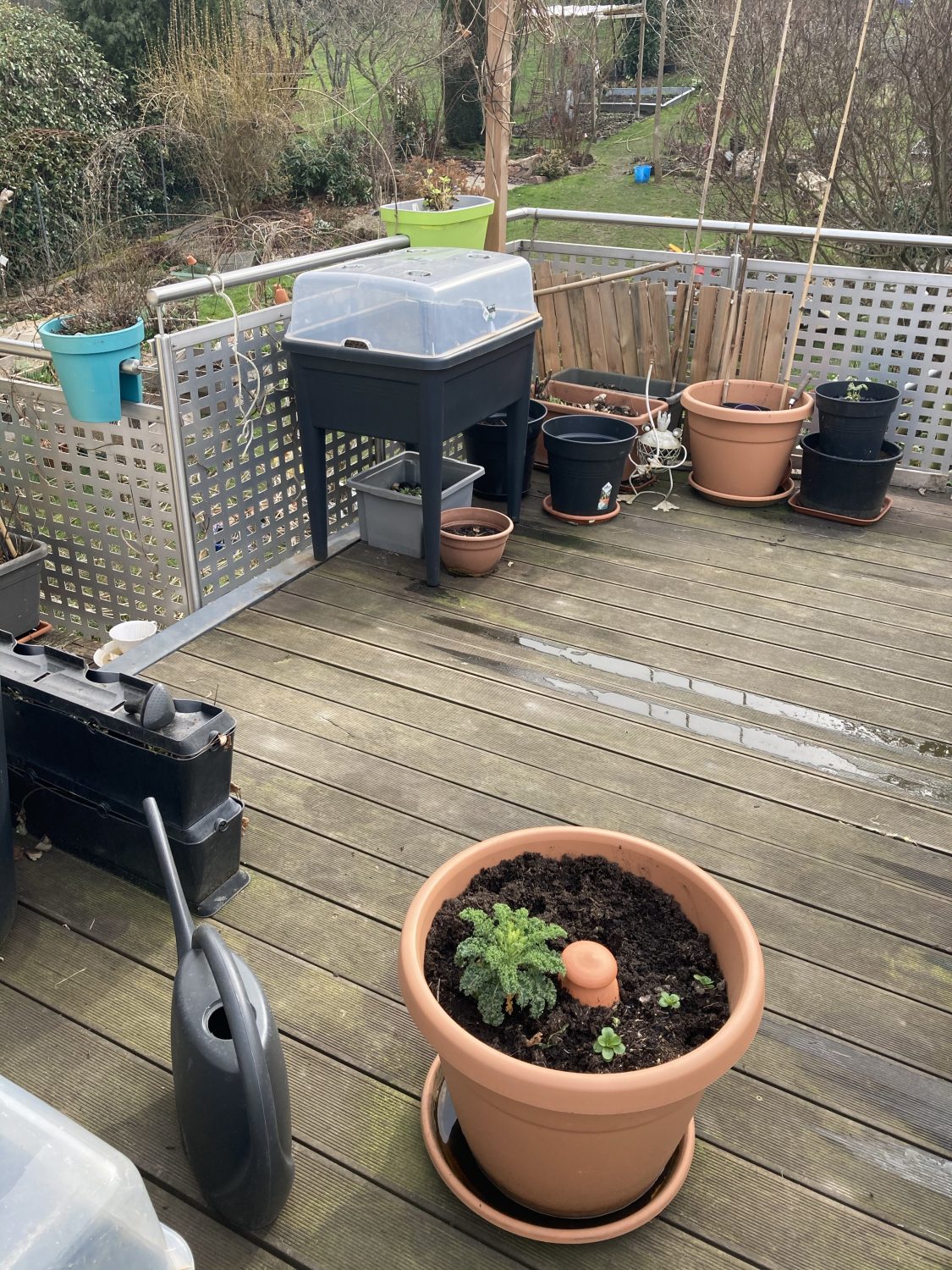 Uih, da hat sich doch ein Bündel Etagenzwiebeln hinter dem kleinen Rollcontainer versteckt. Die kommen jetzt in einen größeren Pflanztopf, in den ich auch gleich noch Samen des „Walking Stick Kale“ einsäe. Den ziehe ich hier vor, will aber nur den stärksten Setzling hier wachsen lassen. In einem weiteren Rollcontainer stecke ich noch einige Puffbohnen.